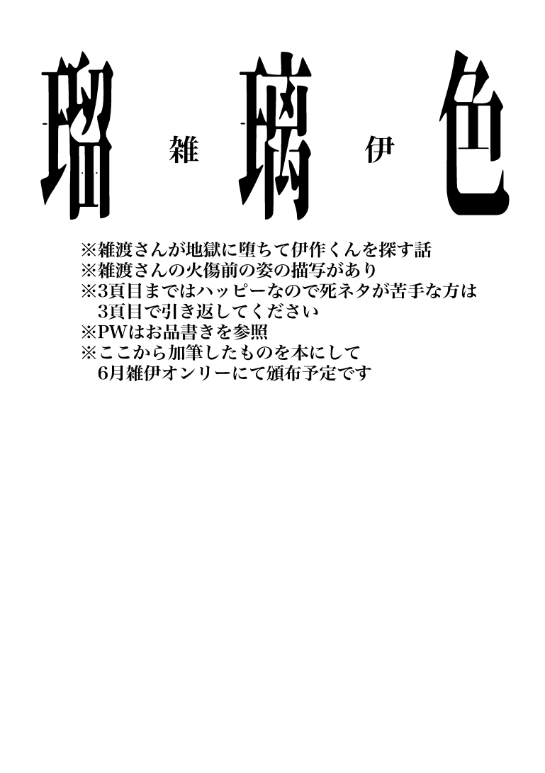ANTI_ker☆quiet followMOURNING雑伊WEBオンリーおめでとうございます!・雑渡さんが地獄で伊作くんを探す話・雑渡さんの火傷前の姿の描写あり・3頁目まではハッピーなので死ネタが苦手な方は3頁目までお楽しみください・ここからあ加筆したものを本にして6月雑伊オンリーにて頒布予定 show hide show all(+16 images) Tap to full screen (size:769x1091).Repost is prohibited Let's send reactions! freqpopularsnackothersPayment processing Replies from the creator Follow creator you care about!☆quiet follow ANTI_kerMOURNING雑伊WEBオンリーおめでとうございます!・雑渡さんが地獄で伊作くんを探す話・雑渡さんの火傷前の姿の描写あり・3頁目まではハッピーなので死ネタが苦手な方は3頁目までお楽しみください・ここからあ加筆したものを本にして6月雑伊オンリーにて頒布予定 17 ANTI_kerMOURNING6/30ジュンブラ無配卵白さんとのコラボイデアズペーパー 2 ANTI_kerDONEたこ恋開催おめでとうございます!!※イデア♂アズ♀女体化のイデアズ※なんでも大丈夫な方向け※モブ寮生がでる 5 ANTI_kerDONE冥海伝説開催おめでとうございます!「SDごっこをしようとする青チ」※SD映画のネタバレを含みます※なんでも大丈夫な方向け⭐︎PWはWEBオンリーお品書きにあります 4 ANTI_kerMOURNING💀全員死刑 5 recommended works emnggggaPAST空回りするアズールに振り回されるイデアのお話🔑タグのひらがな4文字 19 emnggggaDONE深夜のコンビニ、誘惑の国。🔑タグのひらがな4文字 2 よいちDOODLEまだ途中( ;∀;)パスはホームに(お品書きとかはしてないので)ひらがなです。 1201 アルビレオPAST井「急ぐのだ翼宿。子どもたちが待ってるのだ♪」翼「都合のいい時だけ3等身なりくさって!!オレ1人重いやないかっ」 ハーリィDONE眠り王子の話 15 kijinDONEクリスマスデミアイ童貞を殺すセーター御身 4 32age0DONE🎄🦌 ねむ(よるのすがた)DOODLE【オクバデ】くそボロ研究室()壁ほぼ意味ないのに副目力祭の濁点汚喘ぎがでかすぎる💢って感じのバック挿入オバ つるやまDOODLE龍神