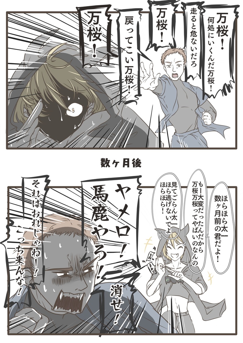身の危険を感じたのか万桜君から全力で逃げると言われて爆笑したので、後日動画撮られてネタにされればいいと思って2コマ漫画描いた!!