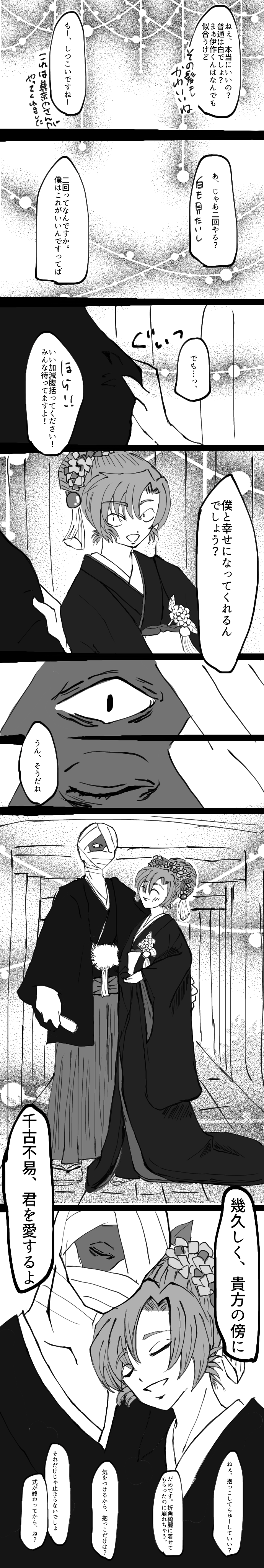 hiwakurage☆quiet followDOODLE人外雑伊の話伊には黒無垢着てほしいなーの結婚式妄想。黒無垢の意味は『私はすでにあなたの色に染まっています』このあと多分白無垢も着たし、なんならウエディングドレスも用意しそうな雑さん ##人外雑伊 Tap to full screen (size:690x4096).Repost is prohibited Let's send reactions! freqpopularsnackothersPayment processing Replies from the creator Follow creator you care about!☆quiet follow hiwakurageDONE8/24開催RKRN怪談webオンリー の展示物です人外の雑渡さんと妖のお医者さんな伊作くんの人外雑伊パロのお話です。人外の雑渡さんは室町の頃、呪いを受けて人外となり、現代まで生き続けています。伊作くんはそんな雑渡さん逢うため何度も生まれ変わって逢いに行き番なりました。そんな雑伊です。現代まで生き続けている雑渡さん、都市噂になってたらいいなの話 5 hiwakurageDOODLE8/24開催RKRN怪談webオンリー の展示物です怪我人の治療をする過程で人の死に触れすぎたが故に、死者の声が普通に聞こえるようになってしまった伊作の話です伊作が逞しいです。同じ世界観の小説がこちら→ https://www.pixiv.net/novel/show.php?id=24259597悪癖=死者の声が聞こえてるのは分かっているけれど、疑うことはせず治療をしてしまうこと 7 hiwakurageMOURNING古のちゃんねる系を雑伊でしたかったやつです。なんちゃってホラー(全然怖くない) 9104 hiwakurageDOODLEバニーの日だそうで。逆バニーのいさく逆バニー服は密林さんで売ってるのを参考にしました hiwakurageDOODLE人外雑伊の話伊には黒無垢着てほしいなーの結婚式妄想。黒無垢の意味は『私はすでにあなたの色に染まっています』このあと多分白無垢も着たし、なんならウエディングドレスも用意しそうな雑さん hiwakurageDOODLE人外雑伊の話梅雨になると湿気で毛玉の怪異になる伊と、そんな伊を甘やかすのがお仕事な雑さん 2 recommended works おきじDOODLE現パロ雑伊らくがき二人でお鍋して締めで雑炊食べてたらいいな 3 ヘヴェンディーモMOURNING体が包み込む2番は伊くんの髪が結んでいる。髪を下ろした方が似合うと思います。 3 蚊取り線香TRAINING毎日かきかき3/23。久しぶりにらくがき。雑伊の概念。 4 とーしゅーDOODLE最近落書きしてるので纏めてみた。顔しか描けない。 13 山月江风DOODLE给姐姐舔批是一种美德 rkrn1025doikiriMENU2024雑伊ジュンブラ新刊のサンプルです!ひとりあそびを見つかっちゃう伊くん(*/ω\*)じゅりあさんのスペースに委託していただいております。(東1サ32ab)ぜひぜひよろしくお願いいたします(*^^*)パスワード(あなたは18歳以上ですか?yes/no) 4 screamwandererPROGRESS sodanocchaDOODLE케리온 커미션이 또 왔답니다~~!!! 연필커미션이에요! ✏낙서맨 님 손그림 흑백연필낙서 타입 입니다!어째선지 글레이즈 프로그램에 업로드가 안되어서 오늘은 포이피쿠에 올림 我是西瓜芋圆DOODLE葱蔚洇润现代part3—初次接生 10