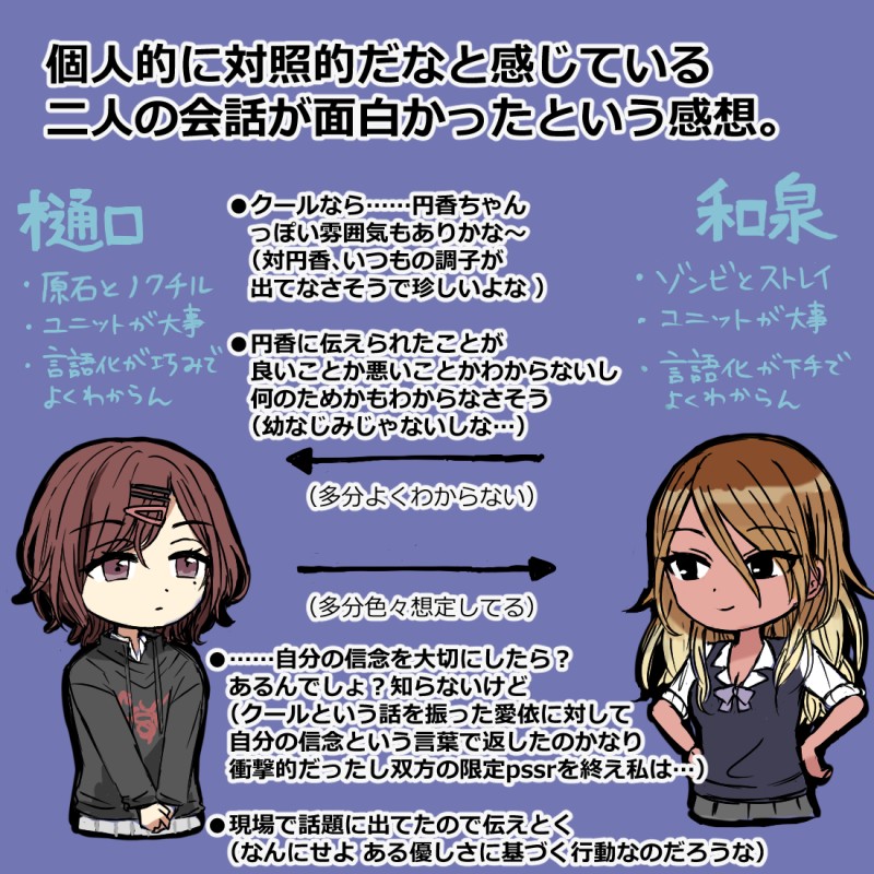雑な魚2☆quiet followMEMO関係性としては驚くほどぐっと来ないんですが、感性が好きな人間たちが会話しておりそう、使う言葉から滲む二人の感性が好きなんだけども、自分にとっては、「ある場所に立つための代償」についてのテーゼとアンチテーゼみたいな印象があるんだよな勝手な印象なので知りませんがどっちかだけ摂取し続けるとけっこうしんどくなるので助かるこの会話見れてよかった仕事上の付き合い Tap to full screen (size:1100x1100).Repost is prohibited Let's send reactions! freqpopularsnackothersPayment processing Replies from the creator Follow creator you care about!☆quiet follow 雑な魚2MEMO関係性としては驚くほどぐっと来ないんですが、感性が好きな人間たちが会話しておりそう、使う言葉から滲む二人の感性が好きなんだけども、自分にとっては、「ある場所に立つための代償」についてのテーゼとアンチテーゼみたいな印象があるんだよな勝手な印象なので知りませんがどっちかだけ摂取し続けるとけっこうしんどくなるので助かるこの会話見れてよかった仕事上の付き合い 雑な魚2PROGRESSひぃ ふゆこ進捗…80%?頑張る次にやりたいものの話なんですがどうして自分を月に例える和泉さんが「自分らしく」を纏ってる芹沢さんと同じ方向を向いているのか…と考えてみて自分が色々考えていたことと絡まってしまい口まで沼に浸かることになりました嘘…形状がしんどいまあ全部曲解幻覚妄想捏造なんですが自分はそういう風に二次創作するのが好きなんだよな楽しめる間だけの祈りです。 雑な魚2TRAINING十数年前のアニメの歌うシーンを軽率にめーあさで練習した歌唱シーン参考に見ながら練習させていただいた 雑な魚2PROGRESS結局ラフをやったしハロウィンは1ページおまけを追加することになったので進捗駄目ですしかも先にこっちやりたくなってるハロウィンは幻覚、こちらは祈りの分類あさめーコンビのみで想像してると永遠と分岐という名の脱線をしていくし5回は本題から逸れるプチ駄菓子屋やりはじめるルートとか発生するふゆこがいたらスッと話纏まる ふゆこ 雑な魚2PROGRESSハロウィンすとれいめっちゃ滾ったのでかいてるホントに配役と森のとこやばすぎです今進捗60%くらいか ひぃん がんばろ色々考えてたところに怒涛のすとれい供給を受けて何故かめーあさの話が浮かんできたのでそれを次にやろうと思う自分の駄目なとこなんだけど、作業中に新しい話が思い浮かぶと先にそっちのラフしようとしてしまうんだよな手が速いわけでもなく…メモ程度でもなく…駄目です 雑な魚2DOODLE息抜きめーあさめー好きなのだけどもふゆこに突撃して欲しいので全部好きしあわせですね recommended works soebnkeDOODLE森銀とか 5 けーこ?DOODLEボ擬人化一応⚠️上裸注意⚠️ 4 IMetabolismKwonDOODLEシャリベルとキール 2 makotoni_happyDOODLEもったいない精神で過去の留伊を再掲マン見えてないけどシてるのでワンクッション。 LaChooWooDONEMetaphor: Re Fantazio Will⚠️ cb dubconpassword: 18+? y/n 2 2CIF0msoQn94072SPOILERアニメディア 138 sumnkenDOODLEpast works. 1st img: 5s + tentacles 2nd img: 5s x echo 2 tamuDOODLEtest 3 noa_yuzuriDONE老夫婦からのクリスマスプレゼント🎁🎄ダリも当然遊ぶよな…【補足】ダリは最終回後もしばらくは老夫婦に完全に心を開く事に対して時間がかかってしまうのでは。そして接する際も緊張感や多少の距離感を保っていそうだなと。そんな慎重な性格を考えると、例え興味があれど老夫婦の前で素直に遊ぶのは難しいのかも(しかしダリにとってはおもちゃで遊ぶよりミギの行動を観察している方がずっと面白いと思っている) 2