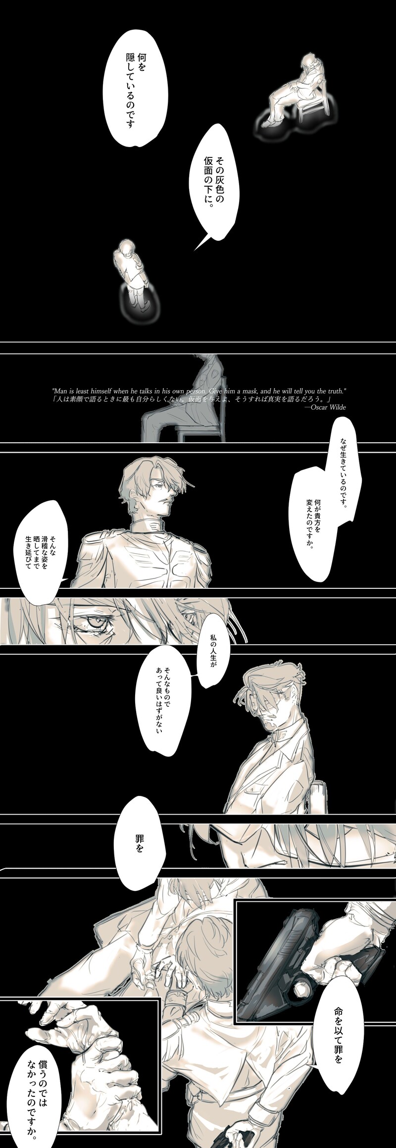 彼の仮面の下にはきっと誰も知り得ない虚無があると思うし、彼はその先に光が救いがあると信じてその道を選んできたのではないよという話です。