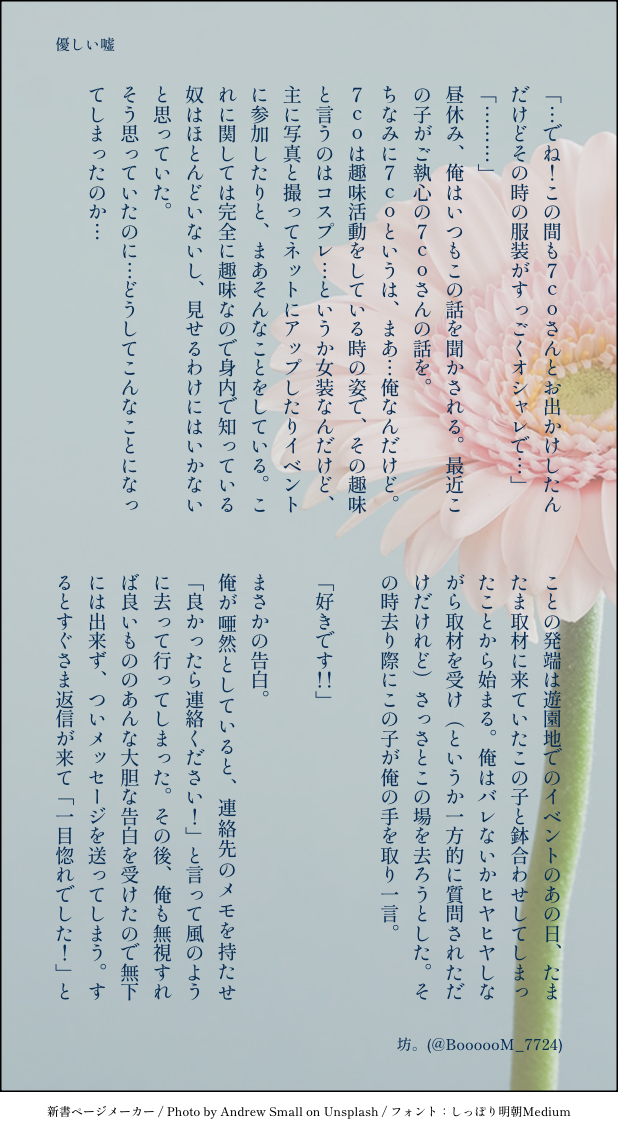 坊さん。☆quiet followMOURNING【ときメモSS】優しい嘘七マリというより、七→マリです。 #ときメモGS4 tokiMemoGs4 #七マリ #坊の掌短編集_虹 show all(+2 images) Tap to full screen (size:618x1132).Repost is prohibited Let's send reactions! freqpopularsnackothersPayment processing Replies from the creator Follow creator you care about!☆quiet follow 坊さん。DONE【屠所の羊たち】泥のように、ねむるハル視点のお話。 2 坊さん。DONE【はいぼく】始まりの物語④ 坊さん。DONE【はいぼく】始まりの物語③ 坊さん。DOODLE【やのみかSS】責任とってください以前書いたものを加筆しました。やのみか、サイコー!! 坊さん。DONE【はいぼく】始まりの物語② 坊さん。DONE【はいぼく】始まりの物語学園青春ドタバタコメディ「拝啓、僕たちへ」よろしくお願いします。 related works ヒトイロDONE身長差まで考慮出来なかったのすいませんでした 羽稚華/十日PAST[七マリSS]キラキラ*パチパチ【過去作再掲】GS4七マリ 在学中。マリィちゃんを自分からデートに誘いたい七ツ森くんのおはなし。キラキラでパチパチマリィ:小波みなこ(おまけページは微々風本七)ーーーーーーーーーーーーーーーお誕生日ネタではありませんが、2024七ツ森実birthdayに寄せて書いた作品なんでもない日常の中に、笑顔と喜びを積み重ねて幸せであれ 9 tokimemoshindoiMOURNING七マリ主人公: 美奈子七ツ森くん: 友好→好きになるくらい生暖かい目で読んで…ください…. 4825 sakumaru0921DONEシクイベ展示七マリ漫画(同棲してる) passは七ツ森くんの誕生日! 7 羽稚華/十日PAST[七マリSS]その日を待つ恋人たちへ【過去作再掲】GS4 七マリ マリィネームレスマリィ一流大学進学後、卒業を控えた二月のお話。二人はいつも幸せで、でもときどきちいさな不安もあって。そんな彼らがもっと幸せになる、誕生日のお話です。⚠︎捏造プレゼント含⚠︎寛容な方向け物語は幸せ行き。ふたりで時を、刻みましょう──。2023年に書いたお誕生日SS 12 HWDKGSDOODLEアップロードテスト 2 羽稚華/十日PAST[七マリSS]365日ともう少し【過去作再掲】GS4 卒業後の七マリ+本マリィネーム:小波みなこ 一流大三年生七ツ森くんは社会人一人暮らしを始めたばかりのマリィちゃんが高熱、甘え下手の彼女に七ツ森くんは──、のおはなし。※なんでもいい人向け2025年お誕生日記念にしばらくポイピクに掲載します 11 みずのDONE七マリ※R18あなたは(高校生除く)18歳以上ですか? yes/no 3 羽稚華/十日PAST[七マリSS]幸福への帰還【過去作再掲】じえす4 卒業後の七マリ ⚠︎モブが少ししゃべりますマリィネーム:小波みなこ本作はピクシブにも掲載しています。2025の七ツ森くんのお誕生日お祝いにしばらくポイピクでも公開します 4