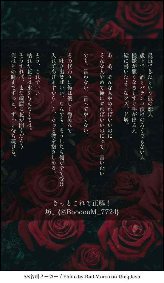 坊さん。☆quiet followMOURNING【夏尾SS】色んな夏尾たち過去に書いた夏尾まとめました。少し手直ししましたが、内容はほぼ同じです。 #金カム腐 golden-camRot #夏尾 natsuo #坊の掌短編集_虹 show all(+4 images) Tap to full screen (size:550x950).Repost is prohibited Let's send reactions! freqpopularsnackothersPayment processing Replies from the creator Follow creator you care about!☆quiet follow 坊さん。DONE【屠所の羊たち】泥のように、ねむるハル視点のお話。 2 坊さん。DONE【はいぼく】始まりの物語④ 坊さん。DONE【はいぼく】始まりの物語③ 坊さん。DOODLE【やのみかSS】責任とってください以前書いたものを加筆しました。やのみか、サイコー!! 坊さん。DONE【はいぼく】始まりの物語② 坊さん。DONE【はいぼく】始まりの物語学園青春ドタバタコメディ「拝啓、僕たちへ」よろしくお願いします。 related works mya_konDONE「吸血鬼が生きる世界には、マッチョが血液を提供するバーがあるのでは?」というフォロワーさんの呟きに反応して、爆発した結果のものです。夏太郎が吸血鬼、尾形がマッチョバー店員やってます 7427 mya_konMAIKINGラジオ体操で繋がる夏尾です。書きかけ?もう少し……先まで続けたかったけど、なんかもう、ちょっと一回投げておきます……☺️多分そのうち続き書きます……多分……いやでも、これはこれでまた書きたいネタがいくつかあるので……ネタ?シーン?まあいいや 3191 mya_konDONEこれは……いつか本になるから……と自分に言い聞かせて書いた夏尾……フォロワーが描いた夏尾見て書いた……わああああああああってなりながら……書いた……いつか本になるから……原稿といっても間違いではない…………… 2759 mya_konDONE「そんなつもりはなかったんだけど」っていう感じの夏尾です。事後の雰囲気?匂わせ?なので質問しますが、何もないです。彼氏ヅラしてくる夏ちゃんが書きたかったはずなんですけど、なんか違いますね。まあいっか。そういうわけであなたは18才以上で、高校生ではないですね? 1583 mya_konDONEこれ https://poipiku.com/808991/7974018.html の続きです〜。なんかいろんなもの盛り込んでみましたが、R-18を名乗るにはぬるく……しかし名乗らないといけない……そういう感じです。なのでいつもの質問ですねあなたは18歳以上で、高校生ではないですね? 5147 mya_konDONEどんぐりひろいやさん かんたろおです〜☺️3で終わると言ったな?あれは嘘だ……次で終わります、ちゃんと終わります……可愛い夏尾だよ……😘1→ https://poipiku.com/808991/7900141.html2→ https://poipiku.com/808991/7922282.html 4270 mya_konDOODLE夏の誕生日である8/1の翌日はバニーの日だ!ってことで混ぜました。なんだろうこれ?よくわからないので、ノーチェックのまま投げます。この夏尾は手を繋ぐのにキャーキャーしてた夏尾です。年齢制限……?となっているので、とりあえずいつもの質問しておきますね。明日読み直して大丈夫そうだったら質問外すかも……?あなたは18才以上で、高校生ではないですね? 2092 mya_konDOODLE何でしょうね。とりあえず心の赴くまま書いてみましたが、何でしょうね……気が向いたらちゃんと書くんじゃないかな……ノープラン…… 1018 mya_konDONE夏ちゃんのアニカム4期参加確定が嬉しくて、夏尾を書きました!!!!!!おめでとうかんたや!!!!!!!!!!!世界が君の可愛さに気づくぞ!!!!!!!!!!!!!!! 1846 recommended works 隅幸(すみゆき)DOODLE夜ノ介さんイノリくん御影先生(仲良しグループ)落書き。グループ可愛い本当に可愛い(*´ω`*) 4 kisaragimesoDOODLE今日は七マリの日…?喫茶店や海辺で七ツ森くんを見つめるのはとても危険!スキになっちゃうー!(どうしてもじろうさん出てくる 鍵子@GS4プレイ中MENU七マリ 美容室に行った帰り、スーパーの駐車場でツイート(垂れ流)した七ツ森くんのお話です。せっかく出来たものは、出来はともかくアップしていく所存。枯れ木も山の賑わい的な❤️ちょっとだけ加筆しました。 1252 nyooon_heart_AREHABILI友情ED後の七マリ プチ小説リハビリになったのかわからんけど、絵が描けない私の精一杯の文字達。 2794 pompommDOODLEときメモGS4らくがきまとめちょいと腐向け気味です 8 詩乃(絵置き場)DOODLE☃️お迎え大マリ(ネタバレなし) nakusanohanaDONEときメモGS4風真くんの叶わぬ恋を見守るひかるちゃんの話です。 7 無理ですDONE ヴェルシーDONE氷室一紀、生誕祭イラスト☆ 3