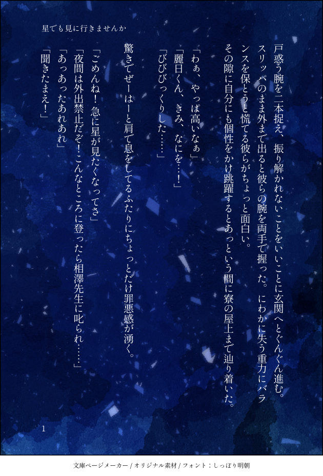 とりのせせり☆quiet followPASThrak 緑茶飯たぶん入寮してからすぐの時期 2㎜ほどデク茶寄りです飯田くんとお茶子ちゃんに夢を見ています show all(+7 images) Tap to full screen (size:630x928).Repost is prohibited Let's send reactions! freqpopularsnackothersPayment processing Replies from the creator Follow creator you care about!☆quiet follow とりのせせりDONE立華兄妹の再会と真マコ。目が覚めないマコトを迎えに行ったのは真島さんの愛だったらいいな。ふわっと空間の話なのでふわっと読んでいただければ…… 12 とりのせせりDONEMHA 葉隠ちゃんの髪を切るかっちゃんの話(notCP)葉隠ちゃんの容姿バレ(?)があります 9 とりのせせりDONE本編から数年後 覚悟を決めた草太さんの話(草鈴/草すず)普通の青年だった草太さんと少し大人になった鈴芽ちゃん 4 とりのせせりDONE吸死 ブロマンスのロナドラいつかくる別れの日のにっぴき 5 とりのせせりDONE本誌注意 No.322前提の妄想洸汰くんとエリちゃんと彼らのヒーロー 2 とりのせせりDONEネウロ(ネウヤコ)魔界に深呼吸しに帰った後の再会までネウロとヤコの関係性が……すき…… 2 recommended works pon_zu80DOODLE #ヒロアカ teruheeeTMP-SAVEらくがきおさなな#ヒロアカ fin3MOURNING氷と炎を付け足したのでここで供養#ヒロアカ #轟 em_daifukuPAST #ヒロアカ #死柄木弔いつぞやのとむらくん。と、加工前のやつです。 2 もちもちこPAST麗らかな白雪姫 蓮子メロンDONE心操くん akuraTRAININGかっちゃんほんと難しい…。 なびゅなびゅPASTかっちゃんの誕生日イラストだったやつ。 ちびぐみDOODLE轟くんの練習〜お茶子付き