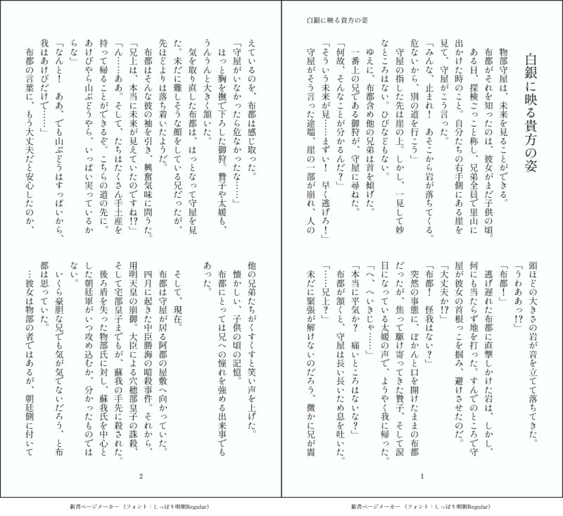 lasagna_rain☆quiet followDONE布都と守屋のシリアス風味なお話。時系列的には、丁未の乱直前。守屋の未来視の力は、ご先祖様である御炊屋媛由来です。ふとした瞬間に、未来のビジョンが見えたり、予知夢を見たり……しかし、結局は断片的なことしか分かりません。万能ではないのです。布都が一族を裏切ったのは、一族以上に神子のことが大事だったからです。馬子の方針は気に食わないが、神子自身もそれを望んでいたため、彼らに協力しました。 ##歴史創作 ##シリアス show all(+2 images) Tap to full screen (size:1235x1132).Repost is prohibited lasagna_rainDOODLE多分まとめていない気がするやつとか、気に入っているやつとか……適当にぶっこんでやったぜッ!ヘッヘッヘッヘェ~~~ッ!健全ですが、色々と閲覧注意です。 24 lasagna_rainDONE河勝♀と守屋がお喋りするだけの、ほのぼのギャグ小話です。思いつきで書いたものなので、出来も含めて割と恥ずかしい。でも投稿する。 3 lasagna_rainDONE赤檮が名もなき男の指をもぎもぎする話。拷問シーンなど痛々しい描写があるので、苦手な方は注意!時系列的には、丁未の乱後、秦氏の族長になった河勝と、河勝の父である丹照が内紛状態にある頃です。 3 lasagna_rainDONE歴史創作絵まとめ~その5~相変わらずの河勝♀率。あとは兄上が多めな気がします。河勝殿はかわいいですね…… 21 lasagna_rainDONE歴史創作×東方キャラ早見表と相関図です。紹介文は適当なので、真に受けないでね! 4 lasagna_rainDONE赤檮が故郷である鳥見村に帰ってみようとする話です。弓に関してですが、鳥見族の弓がどうこうというのは私の完全な妄想です。アイヌの弓や縄文時代あたりの弓をイメージしています。膠で素材をくっつけるような合成弓は、日本の多湿な風土には合わないのですが、赤檮……もとい長髄彦は、和弓よりも自分たちの弓の方が良いと信じているようです。 3 recommended works とりぞのDONE【上弦】あの御方を本気で構わなければならない壱、弐、参のお話。(pixivより移動)リクエストいただいたもの。我が家の無惨様は感情が賑やか。何でも楽しめる方向けです。参は吸うもの。2021年9月4日 20:30(pixivアップ当時のもの) 4 丁路郎/ていじろーDOODLE ヤニカス/スイガラDOODLER18にょたえんむちゃ(モブ魘)催眠姦的な… OzukidakedoMOURNINGトリミング前 TT_Rex_SoloDONE2025/1/10今日は物凄く寒く、雪が降る地域が多いと聞いて書いてみました。諸旬 犬旬 黒旬 白旬 最旬 美旬腐っぽい表現もありますが多少は伏せてるので愛されな感じに見えるようにしました。(たぶん)です。良ければ栄養補給してください!!! 2815 heide_trpgPAST春枯れ行ったときの冬の魔女、すごく癖な女なので自慢しちゃうネタバレあるかないかは謎 顔だけ natfanDONE 2 ねず巳零号MOURNING背景に何描いていいか分からなくなった供養 halluDOODLEミラにいく!!