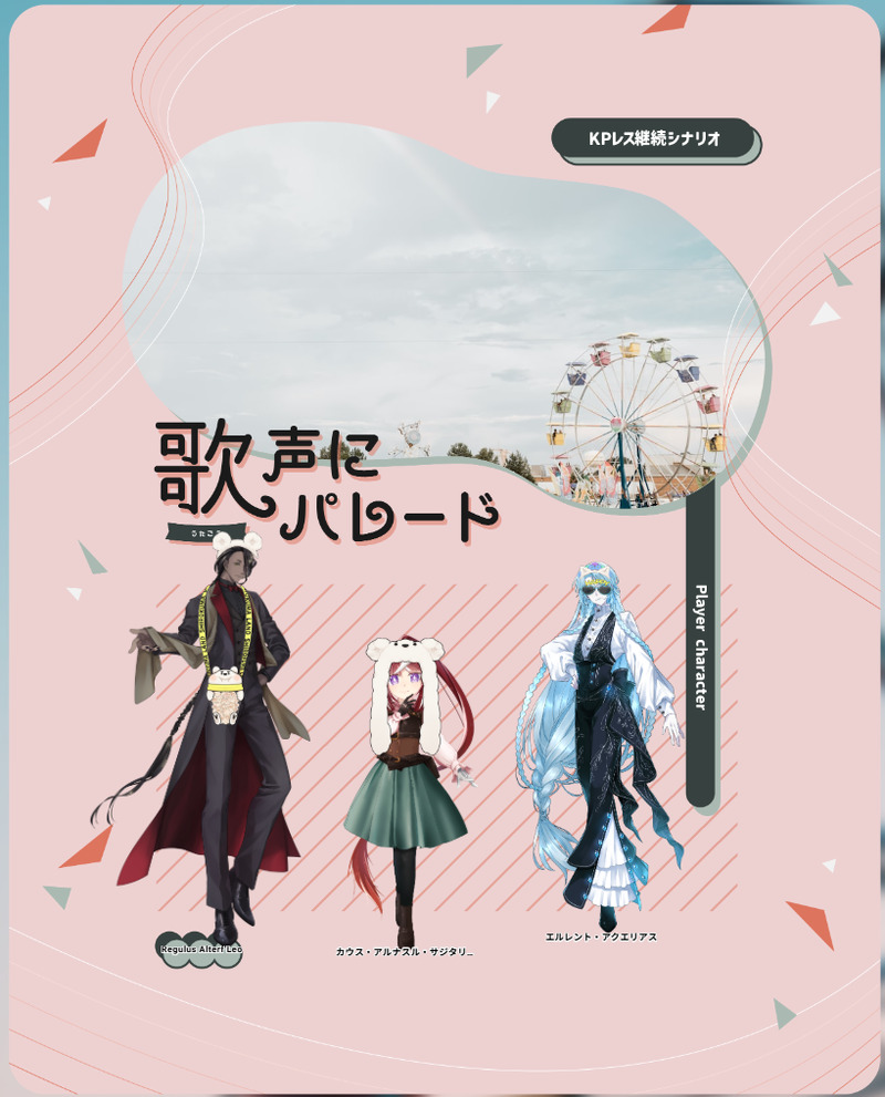2230trpg_17☆quiet followINFO------クトゥルフ神話TRPG『歌声にパレード』作:千来 様PC / PLアルテルフ・リオ/スオウカウス・アルナスル・サジタリアス/藤澤エルレント・アクエリアス/かどない(敬称略)----- Tap to full screen (size:819x1015).Repost is prohibited Let's send reactions! freqpopularsnackothersPayment processing Replies from the creator Follow creator you care about!☆quiet follow 2230trpg_17INFO------クトゥルフ神話TRPG『歌声にパレード』作:千来 様PC / PLアルテルフ・リオ/スオウカウス・アルナスル・サジタリアス/藤澤エルレント・アクエリアス/かどない(敬称略)----- 2230trpg_17INFO------クトゥルフ神話TRPG『人殺しの友人』作:ヒチリ 様KPC / KPMyosot!s / ガトくんPC / PLえびてん🦐 / 藤澤-----END C両生還 2230trpg_17INFO------クトゥルフ神話TRPG『冬鍋に兎』作:千来 様PC / PLエルレント・アクエリアス/かどないコッペリア・アリーズ/おんビルジニー・キャンサー/たけのり梅カウス・アルナスル・サジタリアス/藤澤(敬称略)-----うさ耳差分につきワンクッション 2230trpg_17INFO------クトゥルフ神話TRPG『 APØSTLE 』作:日光堂 様KP / SKPおさかなさんたけのりさんPC / PL風 / ガトくん雷 / 藤澤-----両生還!!!!! 2230trpg_17DONEらんま自⚔️ 3 2230trpg_17INFO------クトゥルフ神話TRPG『 ここ掘れ!メルゴー!穴掘りカレッジ! 』作:大点 様KP 漣PC / PLHO1◆Griffith・B・Sirius / くぅはHO2◆Grace・V・Silvalled / 妖ノHO3◆Ryan・T・Blanchett / 藤澤HO4◆Lysander・S・Blanchett / 茜色(※KPPL敬称略🙇♂️)-----