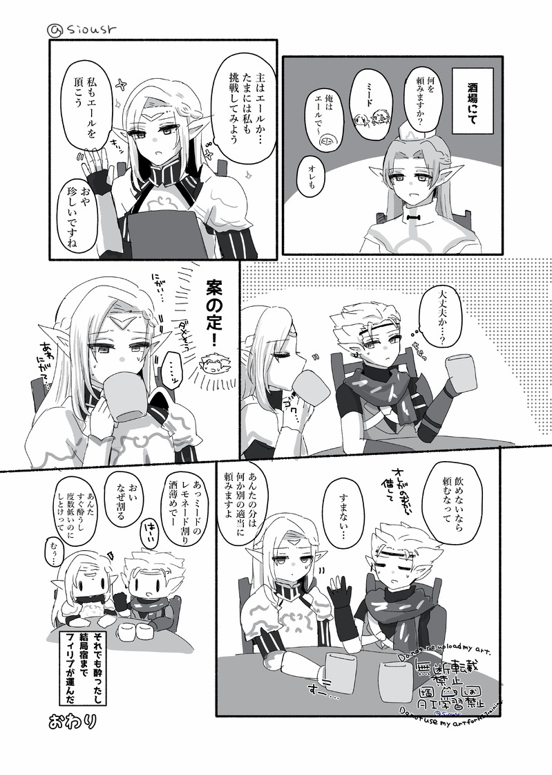 siousr☆quiet followDOODLEウィズダフネリプドラ仲良し漫画ミードってみんな普段はそのまま飲んでるんですか? ##リプドラ ##ダフネ ##漫画 Tap to full screen (size:3638x5102).Repost is prohibited siousrDOODLEウィズダフネ中世おファンタジー私服むずかしいよねっていう日記です。 siousrDOODLEウィズダフネ原稿息抜きにサヴィアらくがき~ siousrPROGRESSメンテはいるのでいったんここまで~🔑くんもだいぶラブな顔をするようになってきたな… siousrMENU9月28日~10月5日エアブー秋の感謝祭、【 D-54】でスペース頂いております。ウィズダフネ、フィリプ×エルドラド(リプドラ)のR18本を頒布予定です。ご興味ある方はよろしくお願いします🐈https://kainekonosu.booth.pmhttps://air-boo.jp/650818/#fronthttps://kainekonosu.booth.pm/items/74 3 siousrDOODLEウィズダフネ城塞不審者ミッションのモブエルフお前のようなかわいい不審者がいるか!推しとおなじ髪型でくっそなさけないこと言っててよかったです。多分死の神は信者が死にそうなときは助けてくれないのでは…? siousrDOODLEウィズダフネ普段と違うPTでキャンプするやつ。ドラド不在の間接的リプドラ漫画です。アーシャちゃんの恋バナしてくれるひと~!が可愛かったので書きました。後日フィリプ君とエルドラドが一緒にいるところを見かけて(あの人がフィリプ君のすきなひとね~☺)って察したりして欲しい。リプドラ、なんだかんだで関係が隠し切れずに周りにじわじわとバレていきそうな気がするんだよな。 recommended works ☕(ジャンルごった煮)PAST2020年のエイプリルフールにて、自身のツイッターのアイコンに使用した過去絵。ログとして、こちらに上げておきます。 小波白狼DONEcaution!この文章には、補助としてAIのべりすと様の機能を使用しています。AIに嫌悪感がある方は観覧をお控えください。また、この小説はメインポーン♂×覚者♂のBL小説となります。以下の要素が含まれるので、大丈夫な方のみ御覧ください。・メインポーン、覚者共に名前がある・ディープキスの表現あり 3211 7miya99_0DOODLEうちのメポ覚竜憑もどきになった翌日。本当はもうちょっとページあったんだけど上手くいかず 7miya99_0DOODLEメポ覚 奔放になったら途端にこれだよ奔放だからね仕方ないね elledieeePAST弊メポ覚設定集①メポ覚最新版②主従逆転時ざっくり設定おまけ・初期の頃のアルディとリエル・ちょっと前ほんの1ヶ月くらいの間に絵柄変わるもんだね…※こっそり修正したり追加したりしていきます 4 elledieeePAST初期のメポ覚詰め合わせ。絵柄永遠に安定してない 6 elledieeePAST1枚絵まとめ① 8 しもつか零MENU7/27 10:00 ~ エアブー にて開催される同人便箋盛上隊3に参加します!【会場】 https://air-boo.jp/496028/#front 【通販】http://3263tyoku2.cart.fc2.com/ 新作はカートから。https://lr3263.booth.pm/BOOTHは創作のセットのみと旧作のセットがあります。当日はよろしくお願いします! 4 elledieeeDONE1周目スフィンクス狂気の謎に挑むアルリエの漫画。メイポにうっかり恋しちゃったけど、ポーンに対してそんな感情持っていいのか分からないのと、恋愛経験不足もあり何もできなかった奥手なリエルさん。色々な感情が芽生え始めるもリエルさんの気持ちが分からないのであくまで従者として真面目に務めてたアルディ。そんな2人なので1周目前半は全く進展なかったけどこのクエストをきっかけにお付き合い始めた感じ。 5
