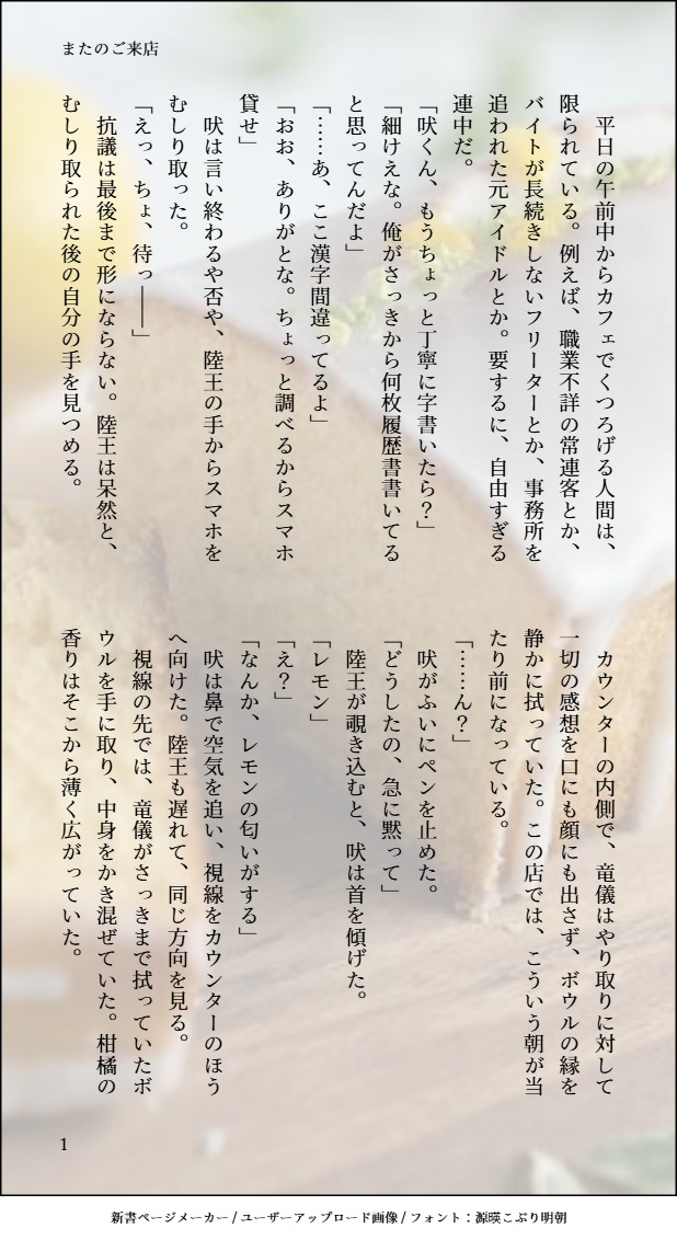 unnunkannun050☆こそフォロできたキーワードをいただいて執筆しました!素敵なアイディア、本当にありがとうございます✨️🍋--🦁と🦖の対決を目前にした、とある平日の午前中。作業をする🦖と、くつろぐ🐺・🦁の話。「またのご来店」 すべて表示(+4枚) タップで全画面(原寸:618x1132)無断転載禁止 リアクションをたくさん送って応援しよう! よく使う人気おやつその他支払処理中 作者からのリプライ 気になる人をどんどんフォローしよう!☆こそフォロ unnunkannun050できた竜儀が生まれてはじめて自炊をする話。 3 unnunkannun050できた信奉者だった者の独白。※時系列は、29話後~31話直前を想定しています。 7 unnunkannun050できた🦁と一緒に、生まれて初めて回るお寿司を食べに行く🦖の話。 9 unnunkannun050できた🐺・🦖・🦅で、テガ里お泊り会! 11 unnunkannun050できた父親の影を思い出した🦖と、🦖の異変に気付く🦁の話。 12 unnunkannun050過去のを晒す23話の後、🦁のケガを🦖が手当てする話。 10 おすすめ作品 らららできた一枚目「花朧-はなおぼろ」二枚目「桜龍-おうりゅう」 2 mune_pipiらくがき多分文化祭終わり。 Leo_ASOBUZEらくがきMua現行未通過❌幼少期捏造自陣二次創作 sakusakufarawoネタバレ久遠の呼び声現行未通過は、ネタバレになる可能性あるので見ない方がいいのかもしれない NIMP010GYできたIm trying this style out, maybe I'll change it later since it doesn't convince me that much oosuko925できたピンクだー!!!!!!!! たかのアキ【イラスト】できたネルちゃん たかのアキ【イラスト】過去のを晒すプロトマーリンとポポッコとチェリムです lukia_wanaromらくがきWhen I read a lot of Japanese fanfics and they describe Cell's beautiful as "doll-like". Of course I was stunned for a moment before trying to imagine what a realistic version (doll like) of Cell