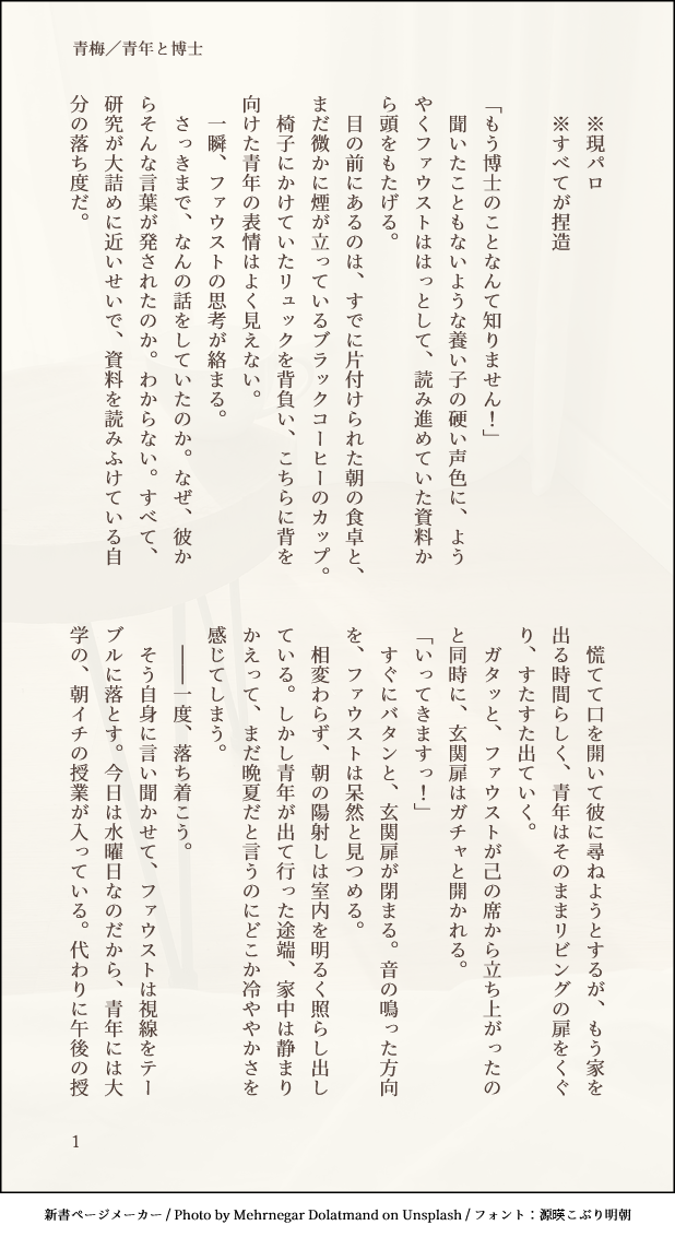 aoumeura0306☆quiet followDONE青年に嫌われたと勘違いしてIQが3になる博士(一行でわかるキャラ崩壊感)※現パロ※すべて捏造 ##現パロ ##青年と博士 show all(+6 images) Tap to full screen (size:618x1132).Repost is prohibited Let's send reactions! freqpopularsnackothersPayment processing Replies from the creator Follow creator you care about!☆quiet follow aoumeura0306DONEコーヒーを飲む青年の話その2山もオチもない※本編の話※まったくの幻覚※思想かもしれない 7 aoumeura0306DONE【おまじない】Heile, heile Segen.博士におまじないをかけて欲しかったです。(ネップリ番号は2枚目に記載してあります) 2 aoumeura0306MENU来たるWebイベのファ青新刊サンプルです。短編再録本『青き春に告ぐ』文庫サイズ/160ページ/R指定/¥500BOOTHにて合言葉販売の予定当日リンクをお品書きなどに公開します。収録内容の詳細は画像からご参照ください。 14 aoumeura0306PROGRESS📕🖋️の表紙途中😂😂😂😂😂😂 3 aoumeura0306DONE【月明かりの海に】※図書館転生if📕🖋※もう付き合ってる耗弱のひとときの話「父」は養父と神の意味を両方持たせたかったけど、難しいものだ。 4 aoumeura0306DONE嵐の夜と恐れの話(たぶん)※便宜上少年と称している※まったくの幻覚 8 recommended works えどさきDONEカケタイ R-18 フェ●好きな子のこと気遣えるタイガくんとってもえらいの絵パス…18↑? y/n zaigaotanyouDOODLE【炼炭】狸猫的出嫁(5) 32 sub_hiyoko23DOODLE aemonoDOODLE会長のパイズリ※相手はモブ ほや🐟DONEみちしるべ刀( '༥' )ŧ‹”ŧ‹”キッド 2 みかえるMEMOデザインこねくり回しているときの色々です。・今と若干変わっている箇所・不確定要素・情報ミスを含みます。 11 sunsunsung_DONEエア・コレクション2024 in Winter 短編漫画展示ページです。ときメモGS3 ルカバン日常漫画 6 HASHIBADONE公式からかわいいランダムステッカーみたいなの欲しい。 roroco316DOODLEMilk your WE Astartes cowᖰ˃̵ ֊ ˂̵ᖳ