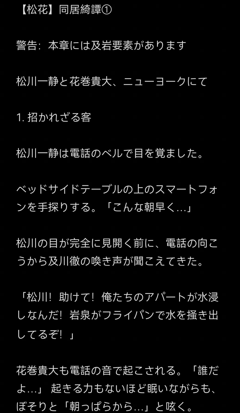vey_lario☆quiet followMEMO初めて書いたものなので、拙いところもあるかと思いますが、温かい目で見守っていただけると嬉しいです!設定:松川花巻のニューヨーク同居パロ #及岩#松花##松花同人#同人小説#BL同人#ボーイズラブ#妄想#匂わせ #ハイキュー#青葉城西#松川一静 #花巻貴大 takedaHanamaki show all(+6 images) Tap to full screen (size:1080x1861).Repost is prohibited Let's send reactions! freqpopularsnackothersPayment processing Replies from the creator Follow creator you care about!☆quiet follow vey_larioMEMO初めて書いたものなので、拙いところもあるかと思いますが、温かい目で見守っていただけると嬉しいです!設定:松川花巻のニューヨーク同居パロ 7 related works vey_larioMEMO初めて書いたものなので、拙いところもあるかと思いますが、温かい目で見守っていただけると嬉しいです!設定:松川花巻のニューヨーク同居パロ 7 recommended works あ、ヤノじゃん!!MAIKINGとりあえず線画描けた。しばらくお絵描き🈲期間なんで色塗りはいつになるやら😭 和麩wafuDONEハイキュー垢始動しました✨ヘッダー完成!!松川と花巻〜 らいかTRAININGスガさん とよみDONEやっちゃんめっちゃかわいいのでつい描いてしまいます はるきDOODLE らいかREHABILI最近みかける赤葦 ぱんちゃDONEなんてめでたい日だっ!!!!!おめでとう!!!!!大好き!!!!!! えぷとDONEIT WAS FUN WHILE IT LASTED,GOODBYE 湊(@kumo_mnt)DONE及川さんで「KING」のフルver.動画を作りました。ニコニコ動画にアップしたので、素人クォリティーですが、よかったら見てください🏐🌿 4