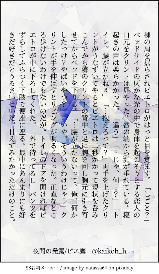 かいこう☆quiet followTRAINING夜間の発露/ピエ鷹 ##ss名刺 ##AVENGERS Tap to full screen (size:550x950).Repost is prohibited Let's send reactions! freqpopularsnackothersPayment processing Replies from the creator Follow creator you care about!☆quiet follow かいこうDONE未来の俺/花流 3395 かいこうDONEイベントの展示に追加できるかな~と思ったけど間に合わなかったんだけどせっかくなので…! 2197 かいこうDONE1011人に聞きたいな♪花流webアンケート、画像おまとめ版です! 14 かいこうDONE1011人に聞きたいな♪お答えくださった皆さま、どうもありがとうございました♡ 5264 かいこうDONE流川楓の敗北/花流花道誕生日当日のお話 6 かいこうDONE誕生日に向かって/花流 7 recommended works かいこうTRAINING楽しかった遊園地/ピエ鷹 かいこうTRAININGメソメソ/ステ→ダノロンドンのパブでメソメソしているダノ かいこうTRAINING動物ビスケット!!!/ダノステタイトルと中身は関係ないような…その➂はー…動物ビスケット食べるスティーヴが見たかったよ~~ 3 かいこうTRAINING悪夢/ダノステ かいこうTRAININGストロベリー作戦/ダノステ 2 かいこうTRAINING誘い文句/ダノ→ステ かいこうTRAINING機嫌のよしあし/ステダノステつき合ってないふたり 3 かいこうTRAINING気にならない/smibやきもちhttps://poipiku.com/120146/2901221.html?10184の続き伊吹がバイ設定 5 かいこうTRAININGよりよいおやすみ➁/smibまだくっついてない 5