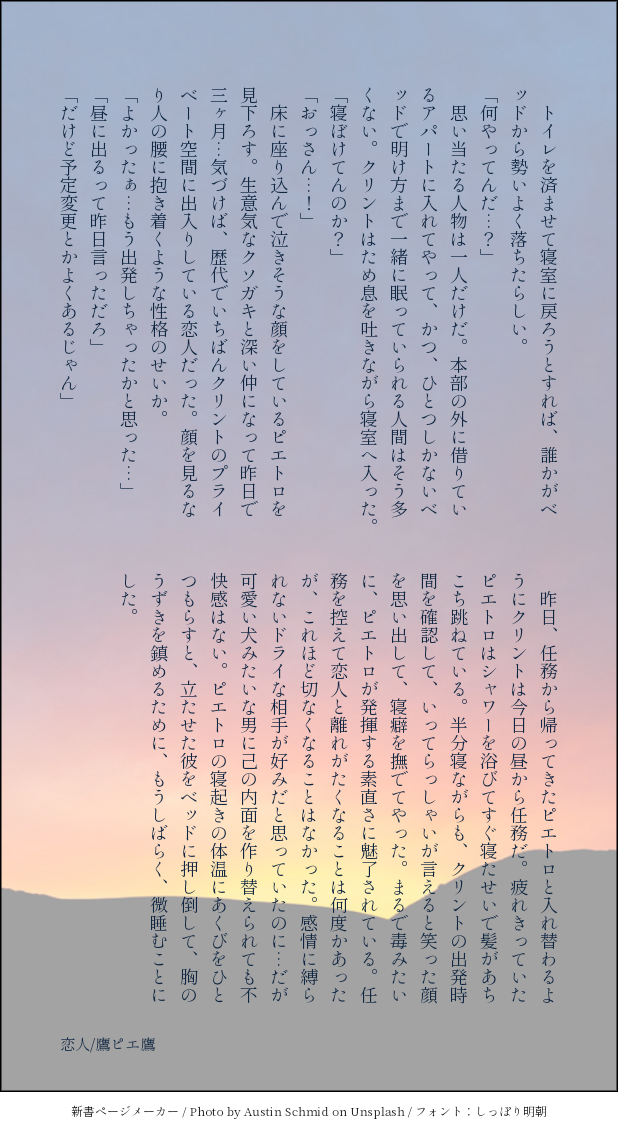 かいこう☆quiet followTRAINING恋人/鷹ピエ鷹 ##ss名刺 ##AVENGERS Tap to full screen (size:618x1132).Repost is prohibited Let's send reactions! freqpopularsnackothersPayment processing Replies from the creator Follow creator you care about!☆quiet follow かいこうDONE未来の俺/花流 3395 かいこうDONEイベントの展示に追加できるかな~と思ったけど間に合わなかったんだけどせっかくなので…! 2197 かいこうDONE1011人に聞きたいな♪花流webアンケート、画像おまとめ版です! 14 かいこうDONE1011人に聞きたいな♪お答えくださった皆さま、どうもありがとうございました♡ 5264 かいこうDONE流川楓の敗北/花流花道誕生日当日のお話 6 かいこうDONE誕生日に向かって/花流 7