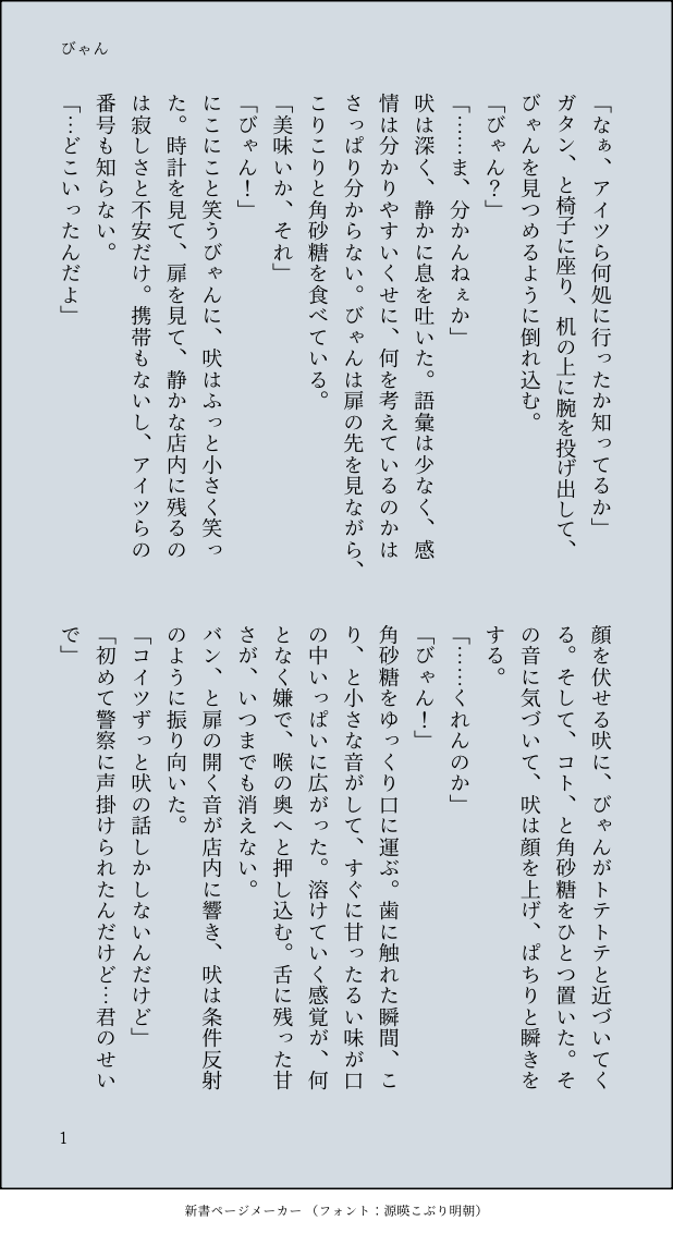 lpnel__26☆こそフォロできたびゃん!最終回が出る前に書いていたものです。鍵にも載せてましたがこちらにも! すべて表示(+2枚) タップで全画面(原寸:618x1132)無断転載禁止 リアクションをたくさん送って応援しよう! よく使う人気おやつその他支払処理中 作者からのリプライ 気になる人をどんどんフォローしよう!☆こそフォロ lpnel__26できたびゃん!最終回が出る前に書いていたものです。鍵にも載せてましたがこちらにも! 3 lpnel__26できた小説版。かんたんびゃくやくん lpnel__26できた赤白の話。タイトルは、ほぼ私の気持ちそのものです。白の最期に納得してる人も多く見かけるけれど、私は㊿も、白も、誰もいなくなって欲しくない。みんな幸せに生きて、最終回後も、ずっと仲良しでいて欲しい。ただ、それだけの願いなのに。 3 lpnel__26できた蜂蜜黄白の話。あんまり深く考えず読んでください。 2 lpnel__26できたGロレポから拝借しました!年末は休みだと聞いたので…。書き納めは同盟で!2025年お世話になりました!2026年もよろしくお願いします! 2 lpnel__26メモ12/30 16:30回 カテコ うろ覚えなので記憶違い多々あります! 1481 おすすめ作品 harunaできた前世の記憶あり現代軸16歳むいゆうシリアスかと思ったら結局18禁ハッピーエンド 14 band_cha0_15らくがきスペの産物びっくりするぐらい落書き※2枚目にょた、3枚目サカ0️⃣前提の🧑🏫0️⃣イチャイチャ 3 madayorudayou作業進捗 インヨ少女できた🍺酒癖の悪い少佐🍺술버릇이 나쁜 쏘령님워터마크 제거 ver ウォーターマーク削除ver 4 tennin5suiらくがき古本屋蜜棺第三話 18 nonono_ota_できたみんなで楽しく飲み会行ってくれ〜!!!!!作業BGM:緑黄色社会『party!!』 2 エールできた4/15 千瀬柚 樂 Happy Birthdayということで樂君のテーマ曲にしてる「限りなく灰色へ」の曲パロを記念に描きました2枚目は………うん。解釈はお任せします。※一部トレス注意トレス元→https://youtu.be/cwLlHFMlBNQ?si=rCMU_ssb-iItGLgx 2 生井さんできたレシピノート付けてる時間な築40年です描き直したので差し替えました👐 Ikawazuらくがき丸座