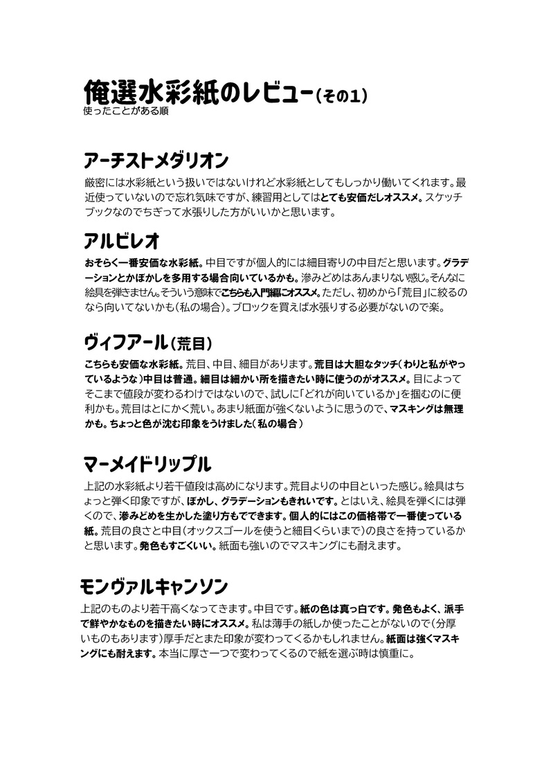 みさご☆quiet followMEMO自分なりに水彩紙の所感をまとめてみました。あくまで私の印象なのであまりあてにしないでください~。要するに全部相性。 #画材 artSupplies ##画材紹介 show all(+2 images) Tap to full screen (size:1500x2122).Repost is prohibited Let's send reactions! freqpopularsnackothersPayment processing Replies from the creator Follow creator you care about!☆quiet follow みさごPROGRESS【作業進捗】微妙にボケが入ってる描き文字をトーンで処理したら何か面白くなった(R18/壮陸) みさごPROGRESS怖くて眠れないので…57原稿…します… みさごPROGRESS【作業進捗】描き文字に全部持っていかれた感。頑張って描いたんですがw(R18/壮陸) みさごPROGRESS【作業進捗】何回同じページ晒すつもりなんですかね…。描き文字を色々直してただけなんですが。描き文字好き。描き文字はロマン。(R18/壮陸) みさごPROGRESS消しがバーコードみたいに見えるあれ。(R18/壮陸)全然まだ終わってないw 2 みさごPROGRESS今日進んだ1コマ(激遅) related works みさごMEMO画材紹介Part3筆編です。紙>筆>絵具くらい大事。私は昔だいぶ軽視してたので、ちゃんとしたの(メーカー品)を買って塗った時にあまりの塗やすさに驚愕しました。もっと高い筆もあるけど流石にむり。 6 みさごMEMO画材紹介Part2絵具関係編です。色数が多ければいいという訳ではないので、どれくらい揃えるかは人によると思います。…私が金持ってるからこんだけ拘れてるわけではなく、単に画材沼にハマってしまっているからです。ご飯より画材。 11 みさごMEMO画材紹介Part1筆記用具編です。大体いつもこんな感じのを使っています。 5 みさごMEMO自分なりに水彩紙の所感をまとめてみました。あくまで私の印象なのであまりあてにしないでください~。要するに全部相性。 3 recommended works roniDONE明けすぎましたが、うり坊とちっこい壮五であけましておめでとうございます🎍 roniMAIKING下書きで断念… ささきむく。DOODLEアホ毛がよくわからないあれです。 suzunomericoDOODLEアイナナにはまってしまった大和すき suzunomericoDOODLEMEZZO"練習 ナカハラPAST 3 ささきむく。DOODLEその目に何を映しているの 青川ハルPAST すめ🐾DOODLEおきつね天陸ちゃん🦊🐾