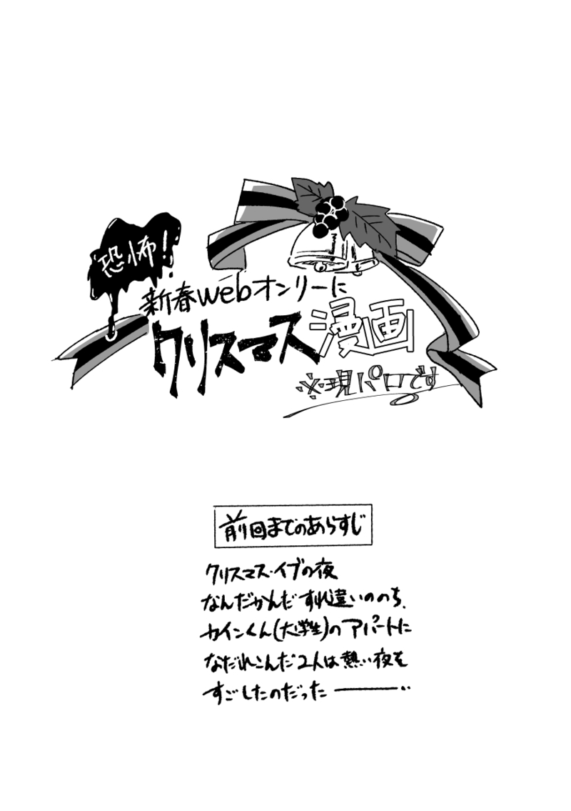 もりです☆quiet followDONEカイオエフェス3展示漫画でした!(4P)新春にクリスマスとは、でしたが実質クリスマスも関係なかった 私は一体何を…? show all(+4 images) Tap to full screen (size:874x1240).Repost is prohibited Let's send reactions! freqpopularsnackothersPayment processing Replies from the creator Follow creator you care about!☆quiet follow もりですDONE【カオPa3展示①】先生アンソロの末席にお邪魔させていただいた漫画でした。 5 もりですDONE【カイオエPATIO2展示②】はなしをするなら夜にでも2022年12月10日開宴の日で出しそびれた本の一部をコピー本にした無配の再録です(ややこしい)しかも発行の日付を間違えています今気が付きました! とても恥ずかしい。 12 もりですDONE【カイオエPATIO2展示①】Today is a Goodday2021年12月10日発行のコピー本再録(全年齢/20p)ゆるゆるの甘口カイオエです。 20 もりですDONE世界を超えてきみを追え展示漫画でした(全年齢/5P)※カインくんの元カノの話が微量にあります! 5 もりですDONEいつカオ2展示漫画です(5P) 5 もりですDONE青春ハッピースプリング展示まんがです(1P)