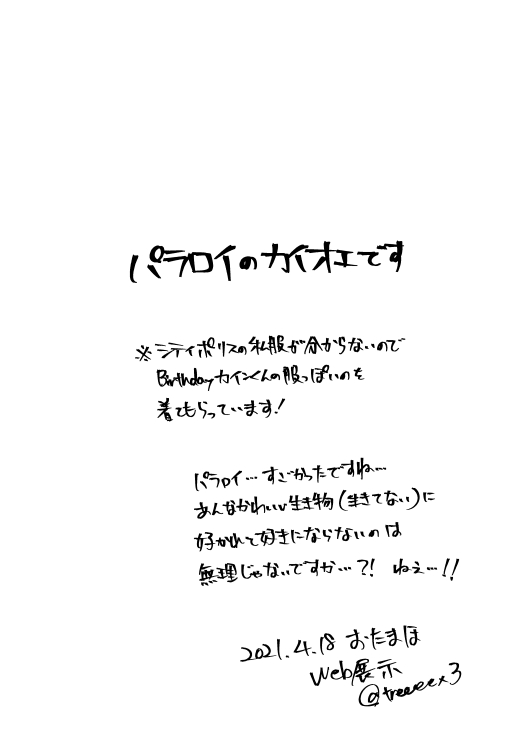 もりです☆quiet followDONEおたまほ2の展示漫画でした!(全体公開に変更済み) show all(+9 images) Tap to full screen (size:529x750).Repost is prohibited Let's send reactions! freqpopularsnackothersPayment processing Replies from the creator Follow creator you care about!☆quiet follow もりですDONE【カオPa3展示①】先生アンソロの末席にお邪魔させていただいた漫画でした。 5 もりですDONE【カイオエPATIO2展示②】はなしをするなら夜にでも2022年12月10日開宴の日で出しそびれた本の一部をコピー本にした無配の再録です(ややこしい)しかも発行の日付を間違えています今気が付きました! とても恥ずかしい。 12 もりですDONE【カイオエPATIO2展示①】Today is a Goodday2021年12月10日発行のコピー本再録(全年齢/20p)ゆるゆるの甘口カイオエです。 20 もりですDONE世界を超えてきみを追え展示漫画でした(全年齢/5P)※カインくんの元カノの話が微量にあります! 5 もりですDONEいつカオ2展示漫画です(5P) 5 もりですDONE青春ハッピースプリング展示まんがです(1P)