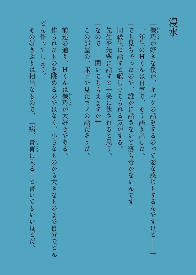 Webオンリーイベント「忍夜百物語(しのびよる・ひゃくものがたり)」向け、執筆中の創作実話怪談集のサンプル?ページです。詳細は「お品書き」をお読みください。
