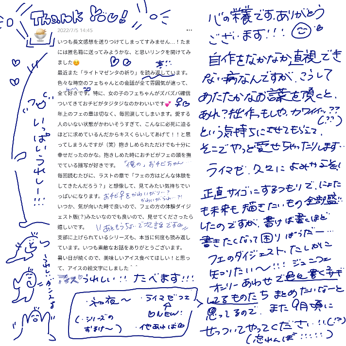 okarapowpow☆quiet followDONEありがとうございます♡♡-7/6!! show all(+1 images) Tap to full screen (size:712x712).Repost is prohibited Let's send reactions! freqpopularsnackothersPayment processing Replies from the creator Follow creator you care about!☆quiet follow okarapowpowDONE25.10.10までに頂いたウェボ〜! ほんとにこんな反復横跳びオタクに優しくしてくれてありがとうございます……人生たのし!! 6 okarapowpowDONE25.7/16-9/12頂いたうぇぼみんな嬉しいんですがみんな、みんな、天才すぎませんこと?! 誇ってほしい ひとをうれしくさせる天才であること…うつくしく愛おしい言葉をつむぐ天才であること…ありがとうございます!! 毎度励みです!おかげさまで人生楽しい全ジャンル大好き、深まるこの世への愛! 残暑(残暑って言葉好き)厳しい折ですが、果物とか好きなものとか食べて心穏やかにお過ごしくださいませ…! 8 okarapowpowDONE2025.06.01〜07.15に https://wavebox.me/wave/6f3w0l5m8utegnfb/ ヘ頂いたおウェーブお返事〜〜!!🌊 ありがとうございます…!✨ ほんとイベや波箱や匿名箱で嬉しいお声かけてくださるみなさまのおかげさまで、作ってよかったな〜!も、もっと色々書きたいな〜!も山盛りで人生楽しいです!! 2 okarapowpowDOODLE2025.4/29〜5/31に頂いた波〜〜ありがとうございます!!!イベ楽しかったな〜〜!本やお話喜んでくださるの嬉しすぎる同人たのしい😭😭🫂 ツイートというか弊人生も見守ってくださりありがとうございます…♡ 日々の大切な時間を縫い貴重なお言葉を届けてくださりぜんぶ大切です本当に幸になっております……!!(お返事漏れ等あったらお気軽に教えてやってくださいませ…!) 10 okarapowpowDONEまたも大変お待たせしましたうぇぼお返事ー!! これにて今までいただいた波は一旦ぜんぶお返しし終えられたかしら…?! もし私のないにゃけどって方いらしたら絶対私の追加漏れなだけなので本当お気軽に教えてやってください…!今回からペーパーライクフィルム取っちゃったから超ペン先がスベッている!ただでさえ難読なのに!! いっぱいありがとございましたー!! 9 okarapowpowDONE2024年6月〜2025年4/20までの、hrak関係作に頂いたご感想へのお返事ー!!!!時差にもほどがあるおそおそですみません…!!読み返してたらたくさんのうれしい気持ちを頂き、当時の私の果てしない心の栄養であったことを思い出しつつ、今の私の元気もチャージさせていただいちゃいました…!!そしてみんなさん出ツーへの愛がふっっかくて…私も書きたくなっちゃったー!!ありがとうございます!! 30 recommended works 阿枫茶啊DOODLEsouthpark人物 8 SanphyDONE #bbonly527 / ONE FINE DAY230527. ぬいぐるみのなまえは? 読む方向 ⊙-> 18 顾黎DelphinusnyaDOODLE约稿!好吃…… たねいもPROGRESS構図案 hidariDOODLE黙示録※残酷表現あり 5 咲でございますDOODLE 44 hemogurominDOODLEネットミームにあやかり touzi1110DOODLE『彼岸へ続く赤い糸』最終章ドドゲザン(旗本の男)の目の前でピーニャが犯されるお話(ドドピニャ前提モブピニャ)※注意事項※・めちゃくちゃご都合展開・がっつりモブピニャ描写あり・暴力表現ありよく分からない展開が続きますのであまり深く考えず、優しい目で閲覧して下さい パスは鍵垢にあります 14168 yuki8563DOODLEChester x Mandy 🔞🔞?? 2