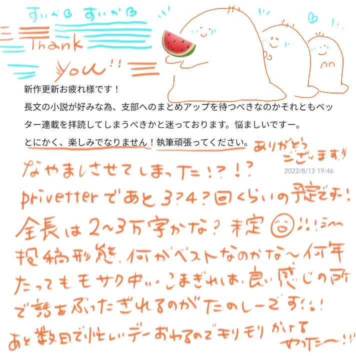 okarapowpow☆quiet followDONEありがとうございますー!果たして主さんはプラベかpixivかどちらを選択されたのか…真相はいかに!?(更新もお返事もカメさんマイペースですみません!) Tap to full screen (size:712x712).Repost is prohibited Let's send reactions! freqpopularsnackothersPayment processing Replies from the creator Follow creator you care about!☆quiet follow okarapowpowDONE25.10.10までに頂いたウェボ〜! ほんとにこんな反復横跳びオタクに優しくしてくれてありがとうございます……人生たのし!! 6 okarapowpowDONE25.7/16-9/12頂いたうぇぼみんな嬉しいんですがみんな、みんな、天才すぎませんこと?! 誇ってほしい ひとをうれしくさせる天才であること…うつくしく愛おしい言葉をつむぐ天才であること…ありがとうございます!! 毎度励みです!おかげさまで人生楽しい全ジャンル大好き、深まるこの世への愛! 残暑(残暑って言葉好き)厳しい折ですが、果物とか好きなものとか食べて心穏やかにお過ごしくださいませ…! 8 okarapowpowDONE2025.06.01〜07.15に https://wavebox.me/wave/6f3w0l5m8utegnfb/ ヘ頂いたおウェーブお返事〜〜!!🌊 ありがとうございます…!✨ ほんとイベや波箱や匿名箱で嬉しいお声かけてくださるみなさまのおかげさまで、作ってよかったな〜!も、もっと色々書きたいな〜!も山盛りで人生楽しいです!! 2 okarapowpowDOODLE2025.4/29〜5/31に頂いた波〜〜ありがとうございます!!!イベ楽しかったな〜〜!本やお話喜んでくださるの嬉しすぎる同人たのしい😭😭🫂 ツイートというか弊人生も見守ってくださりありがとうございます…♡ 日々の大切な時間を縫い貴重なお言葉を届けてくださりぜんぶ大切です本当に幸になっております……!!(お返事漏れ等あったらお気軽に教えてやってくださいませ…!) 10 okarapowpowDONEまたも大変お待たせしましたうぇぼお返事ー!! これにて今までいただいた波は一旦ぜんぶお返しし終えられたかしら…?! もし私のないにゃけどって方いらしたら絶対私の追加漏れなだけなので本当お気軽に教えてやってください…!今回からペーパーライクフィルム取っちゃったから超ペン先がスベッている!ただでさえ難読なのに!! いっぱいありがとございましたー!! 9 okarapowpowDONE2024年6月〜2025年4/20までの、hrak関係作に頂いたご感想へのお返事ー!!!!時差にもほどがあるおそおそですみません…!!読み返してたらたくさんのうれしい気持ちを頂き、当時の私の果てしない心の栄養であったことを思い出しつつ、今の私の元気もチャージさせていただいちゃいました…!!そしてみんなさん出ツーへの愛がふっっかくて…私も書きたくなっちゃったー!!ありがとうございます!! 30