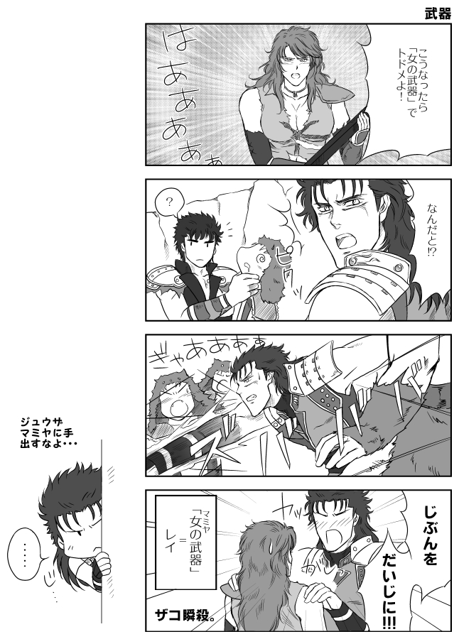 PS3真北斗無双プレイ時に描いた4コママンガ。原作が尊すぎてほとんどマミヤを描いたことがないので自分的に新鮮でした。