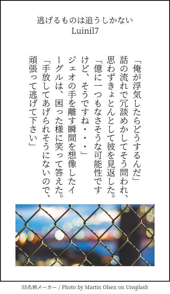 Luinil7☆quiet followTRAINING診断メーカーが悉く対になるような結果しか吐かない貴方はイーグルで『逃げるものは追うしかない』、ジェオで『愛せるなら愛してみろ』をお題にして140文字SSを書いてください。#shindanmakerhttps://shindanmaker.com/375517 show all(+1 images) Tap to full screen (size:550x950).Repost is prohibited Let's send reactions! freqpopularsnackothersPayment processing Replies from the creator Follow creator you care about!☆quiet follow Luinil7DOODLE翼さんの『47話if クレイーカラダスキャン(https://plus.fm-p.jp/u/yumeiro_wing/book/chapter?id=7&bid=22)』で触手に体中モニモニされるイーくん。えろの才能がない・・・(˘ω˘) Luinil7DOODLEすみー様の『真面目で優秀な軍人さん』の前髪かき上げイーくんが好きすぎて勝手に描きました(小声)でもコレジャナイ。あのシーンはもっと汗と情欲に濡れつつ"最強"を覗かせるちょっと好戦的な光を宿した瞳と、かき上げた隙間から零れ落ちて顔にかかった髪の一筋にすら色気が宿るような、凄絶にエロいイーくんがいたんだ・・・・・・・・・!!!画力・・・・・・・・・・・・・・・!!!!!!(床をガンガン殴りながら) Luinil7REHABILI何も考えずに書き始めたので何がしたいのか謎の文が出来上がった。スパロボ時空ジェオイ。各艦の艦長達で定例ミーティングやってることにしといてください。 1572 Luinil7MOURNINGみなさんが海の日記念で色んな海ちゃんをアップされてたので、私も何か書くか〜とお題ガチャして出てきたのがコレだった。うーん診断メーカーくん流石。しかし毎回似たような話で申し訳ない😇 2195 Luinil7DOODLE山も谷もオチも意味もないジェオイ漫画。なぜ薬が液体なのかって話の都合上です(潔く開き直るオタク)口移しで薬飲ませるのが性癖なんじゃ〜〜〜 2 Luinil7DOODLEまねきねこコラボありがとうの巻 4 related works SasameREHABILIあなたは細雪んちの獠香で【噛んで微笑ってもう一度キス / あれは嘘だった】をお題にして140字SSを書いてください。#shindanmakerhttps://t.co/FT9UR8u5Hs過去最短で書いた気がする( *¯ ꒳¯*)フフン かほる(輝海)DONEシティーハンター冴羽獠×槇村香原作以上の関係かほるさんちの香で「生きる」と「地獄」のお話はどうでしょう? 5ツイート(700字)以下だと嬉しいですっ!#CHしたったー #shindanmakerhttps://shindanmaker.com/965157何か暗い感じになっちゃったけど、これで許して…(´・ω・`)この後は二人で天国へ行った(イッた?)に違いない(*´艸`*) 2 aosabikinakoTRAINING貴方はハル相で『最大級の口説き文句』をお題にして140文字SSを書いてください。#shindanmakerhttps://shindanmaker.com/375517 rick_underworldDONE貴方は🌹→☕️で『口説き落としてみせる、って』をお題にして140文字SSを書いてください。2022/12/13そう思っていたのに、#shindanmakerhttps://shindanmaker.com/587150 かほる(輝海)DONEシティーハンター冴羽獠×槇村香原作以上の関係あなたはかほるさんちの香ちゃんで【癖になるかも / 行儀の悪さは艶やかさ】をお題にして140字SSを書いてください。#shindanmakerhttps://shindanmaker.com/780366これはお行儀が悪い方が萌える(*´艸`*) SasameREHABILIあなたは細雪んちの獠香で【噛んで微笑ってもう一度キス / あれは嘘だった】をお題にして140字SSを書いてください。#shindanmakerhttps://t.co/FT9UR8u5Hs『血の証』を見た獠ちんからクレームがありまして「書き直せ!!」と言われちまったよ…(*꒦ິ꒳꒦ີ*)獠ちんが悪いんじゃん!! かほる(輝海)DONEシティーハンター冴羽獠×槇村香原作以上の関係書き手募集していたのでびんじょった(*´ω`*)Rさま(@ryu_wen)ありがとうございました!Rんちの冴羽くんと香で「唇」と「「ばぁか」」のお話はどうでしょう? 1ツイート(140字)程度だと嬉しいですっ!#CHしたったー #shindanmakerhttps://t.co/2IQJRYQwf0 こよみTRAININGこよみんちの獠と香で「バスタイム」と「モーニングキス」のお話はどうでしょう? 1ツイート(140字)以下だと嬉しいですっ!#CHしたったー #shindanmakerhttps://shindanmaker.com/965157ギャグ路線?😅お題の言葉は直接は使ってない😅直接表現はしてないので、全年齢。 opinel432DONETSりんわかBLさんは『もしかして誘ってる?』をお題に、140字でSSを書いてください。#shindanmakerhttps://shindanmaker.com/320966 recommended works みなづきDOODLE今日のみなづきのアシュピオ宅飲みで酔って絡み酒。最終的に気分を悪くし介抱された挙句抱き着いたまま寝落ちる。#今日の二人はなにしてる #shindanmakerhttps://shindanmaker.com/831289 3 aosabikinakoTRAINING※門司くん独白※貴方は門司くんで『最後の言葉』をお題にして140文字SSを書いてください。#shindanmakerhttps://shindanmaker.com/375517 aosabikinakoTRAINING※右エンド風味貴方はチア相で『美しい終わり方』をお題にして140文字SSを書いてください。#shindanmakerhttps://shindanmaker.com/375517 かほる(輝海)DONEシティーハンター冴羽獠×槇村香原作以上の関係あなたはかほるさんちの獠で【キスの雨 / 浴衣でGO!】をお題にして140字SSを書いてください。#shindanmakerhttps://shindanmaker.com/780366これは、お題が…!😂 142 高間晴TRAINING晴のチェズモクさんは『君に預ける』をお題に、140字でSSを書いてください。#s