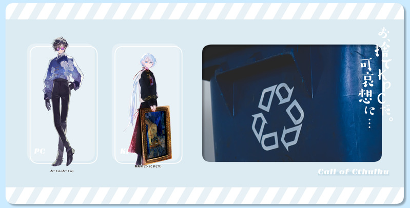 tadanoakuta☆quiet followDOODLEクトゥルフ神話TRPG ▹▸ーーーーーーーーーー▹▸ お、捨てKPCだ。可哀想に… ▹▸ーーーーーーーーーー▹▸シナリオ:竜原様🅚🅟🅒: 駒鳥/さわちゃん🅟🅒/🅟🅛: みーくん/かげきち今日は60センチだった Tap to full screen (size:2384x1211).Repost is prohibited Let's send reactions! freqpopularsnackothersPayment processing Replies from the creator Follow creator you care about!☆quiet follow tadanoakutaDOODLECoC 6th 『永久の一日』作:ポッケの中 様【 KP 】こんさん【 PC 】空木 然 / ねのひさん土野 小太郎 / もももさん川崎 輪 / ただのかげきち平良 凪 / びふまるさん【True END】終わりよければすべてよし! tadanoakutaDOODLECoC6【Miniature】シナリオ作:丼様KP:ケイさんPL:🧈 にゅーさん 🍨 さわちゃんさん 🍫 やましたさん 🍼つつさん 🍓かげきち𝑬𝑵𝑫 - 3 ♥ 全生還目的大達成で楽しかったな~~ tadanoakutaDOODLECoC6【ぴんぐとむ】シナリオ作:しゃも痔様KPC/KP:駒鳥/さわちゃんPC/PL:みーくん/かげきちコマちゃんて…… tadanoakutaDOODLEクトゥルフ神話TRPG◤ 同じ空には昇れない。 ◢作者:○助様KP:水月さんHO太陽☀️ 朝田 日生 / めめんと森さんHO月🌙 アルフォンソ / かげきちC-1B▸ 両生還にてシナリオ終了めちゃくちゃおもしろかった~~~いい雰囲気だ……。 tadanoakutaDOODLE◤ モノクロルミエール ◢作者:深海図書館8番地 さま𝘒𝘗 びふまるさん𝘏𝘖オオカミ🐺 真神 大牙 / かげきち𝘏𝘖ヤギ🐐 小森 紡里 / こんさんエンド2すっごいシナリオの雰囲気味わえて楽しかった!エンドカードありがとうびふまるさん! tadanoakutaDOODLE・・・♡・・・・・・♡・・・・・・♡・・・CoC6『催眠ダーリンLv1』シナリオ作者:竜原様KPC:みーくん/かげきちPC:駒鳥/さわちゃん男性側が催眠かかるの熱い。セクシー担当として頑張った。・・・♡・・・・・・♡・・・・・・♡・・・ 2