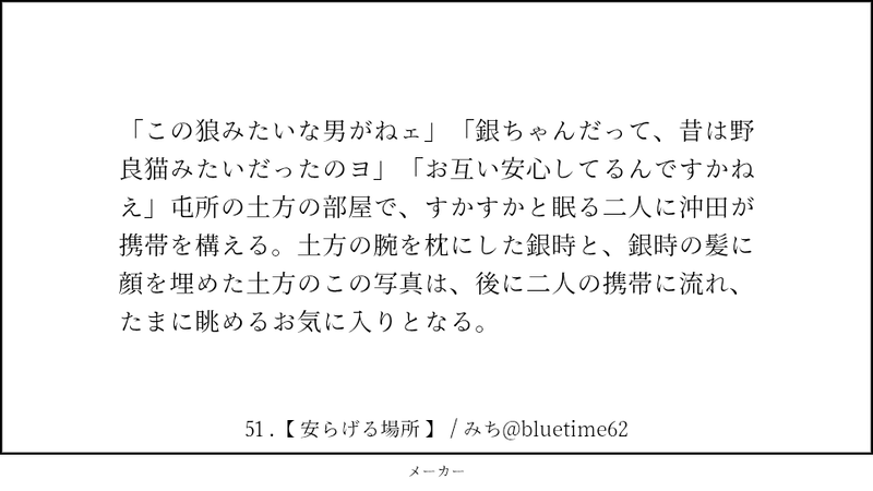 bluetime62 @bluetime62 まいにち140字@土銀のカードその他保管用自主練→140字できた→土銀ワンライその他企画メモ→その他 ☆quiet follow Yell with Emoji Tap the Emoji to send POIPOI 26
