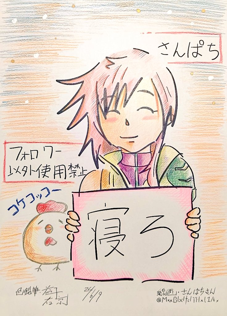 さんぱちさんの線画にオジイが色鉛筆で塗らせて頂きました🥰明け方っぽく色塗って、ニワトリはオジイが落書きしました😅