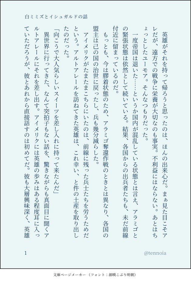 てんの SSログ置き場と最近はTRPGの差分とか落書きとか。Twitter:@tennoia(二次)/@tenno_trpg(TRPG) ☆quiet follow Yell with Emoji Tap the Emoji to send POIPOI 268