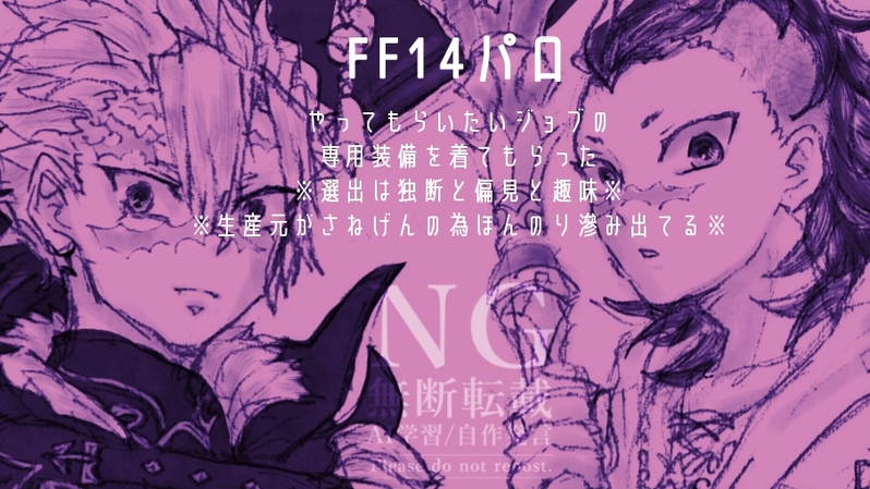 M(emu)☆こそフォロらくがき⚠某MMOゲーム作品パロ⚠立ち絵だけだけどキャプションに🍃🍉が滲み出てる前回着せたかった装備を着せる以外にも👹滅キャラ達に色々と着て欲しいジョブが浮かんできたので、引き続き趣味に走り続けました。兄弟以外も描きたい気持ちがあるので更新するかも。 すべて表示(+1枚) タップで全画面(原寸:905x509)無断転載禁止 リアクションをたくさん送って応援しよう! よく使う人気おやつその他支払処理中 作者からのリプライ 気になる人をどんどんフォローしよう!☆こそフォロ M(emu)らくがき⚠某MMOゲーム作品パロ⚠立ち絵だけだけどキャプションに🍃🍉が滲み出てる前回着せたかった装備を着せる以外にも👹滅キャラ達に色々と着て欲しいジョブが浮かんできたので、引き続き趣味に走り続けました。兄弟以外も描きたい気持ちがあるので更新するかも。 2 M(emu)らくがき⚠某MMOゲーム作品パロ⚠3pから『女体化』あり(間にワンクッション挟んでます)そんな感じの🍃🍉。趣味と本能に走りまくってるので何でもバッチコイな方のみ推奨。デジタル練習ついでに、ずっと2人に着せてぇな……と思っていた某ゲームの装備を着せた。そしたら勢いで女体化させていたし漫画も描いた。漫画はふわっとしたパロ世界観なので深く考えずどうぞ。幻想薬はとても素敵な課金アイテムです。 4 M(emu)できた今年のげんやくんハピバイラストより。はにかみ笑顔と装飾の色諸々に尊さを感じ天を仰ぎそっと涙を流してます。※盛大に西暦を間違えて居た………しれっと直しました………… M(emu)できたHappy Birthday 不死川玄弥 !!これまでもこれからもたくさん兄ちゃんに愛されて幸せになってください。 3 M(emu)らくがき※ 注意 ※ 女体化 ※TLでお見かけした話題のお洒落デザインのお洋服に感化された上でちょうど女の子を描きたかった気分だったので女体化となった🍉クン美脚であれ~ 2 M(emu)らくがきご縁があって過去に登場した⚔️鍛冶の里くじの🍉クンフィギュアをお迎えすることが出来たのですが、組み立てる際に感じてしまったことをお兄さんに代弁して頂いた。🍃🍉。モロな発言はしていないけど下ネタなのでご注意ください。そこは兄だけの聖域では?!?!?!?!(クソデカボイス)※12/5 描き漏らしあったのでこっそり差し替えました……orz 2