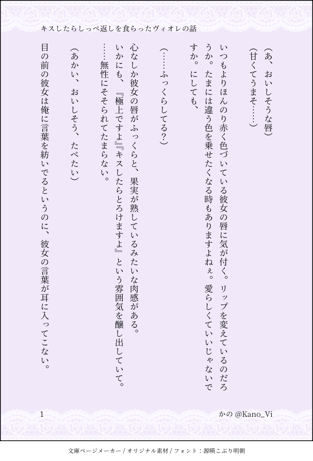 Kano_Vi☆こそフォロ過去のを晒すヴィオレッタ♡ちゃんSSキスしたらしっぺ返しを食らったヴィオレの話(全8P)▪︎ヴィオレ視点ーーーいつも通りマスターちゃんにキスしたら唇に異変が起こって……?ちょっと不憫なヴィオレです。 すべて表示(+7枚) タップで全画面(原寸:630x928)無断転載禁止 リアクションをたくさん送って応援しよう! よく使う人気おやつその他支払処理中 作者からのリプライ 気になる人をどんどんフォローしよう!☆こそフォロ Kano_Vi過去のを晒すヴィオレッタ♡ちゃんSSポッキーゲームをするマスターちゃんとヴィオレの話(全18P)▪︎マスター視点ーーー出来心でポッキーゲームを持ちかけたらやはりヴィオレに翻弄されちゃうマスターちゃん。・途中ほんのりセンシかもしれません 18 Kano_Vi過去のを晒すヴィオレッタ♡ちゃんSSマスターちゃんとヴィオレがはんぶんこするだけの話(全7P)▪︎ヴィオレ視点ーーーはんぶんこですぐに大きい方を差し出すのってとっても愛だなぁという話。この二人だったらきっとすぐに大きい方をくれるでしょう。 7 Kano_Vi過去のを晒すヴィオレッタ♡ちゃんSSエスコートが気になったマスターの話(全9P)▪︎マスター視点ーーーヴィオレのエスコートに思うところがあるマスターちゃん。 9 Kano_Vi過去のを晒すヴィオレッタ♡ちゃんSSヴィオレの貴重な姿を見れたマスターの話(全12P)▪︎マスター視点ーーーある朝、ヴィオレの"身支度"に遭遇したマスターちゃん。 12 Kano_Vi過去のを晒すヴィオレッタ♡ちゃんSSキスしたらしっぺ返しを食らったヴィオレの話(全8P)▪︎ヴィオレ視点ーーーいつも通りマスターちゃんにキスしたら唇に異変が起こって……?ちょっと不憫なヴィオレです。 8 Kano_Vi過去のを晒すヴィオレッタ♡ちゃんSSぬいぐるみにやきもきするヴィオレの話(全6P)▪︎ヴィオレ視点ーーーぬいぐるみと張り合おうとするヴィオレです。 6
