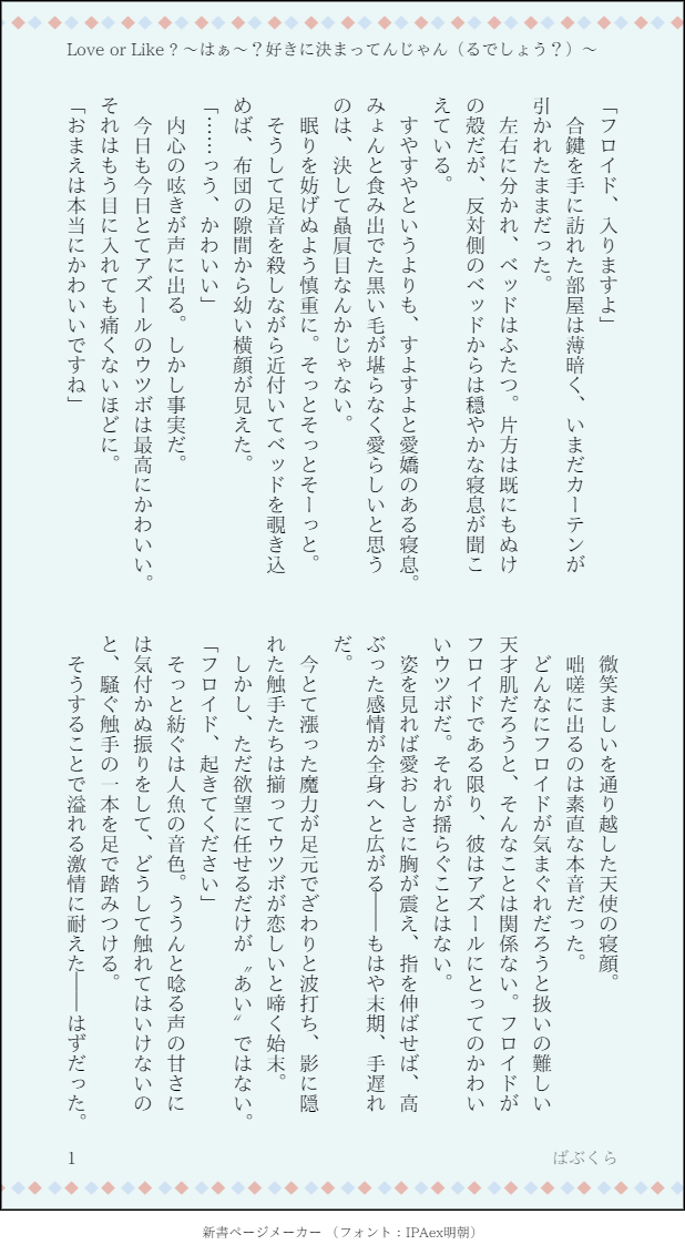 フロアズ練習2。いつものように前提ありきとして読んで頂いても大丈夫です。一見フロアズなのに付き合ってないふたり。お互いをかわいいと思ってるしめっちゃ好き。でも付き合ってない。出て来る「好き」「あい」は恋愛感情ではないです。巻き込まれたエースとデュース。全11P。