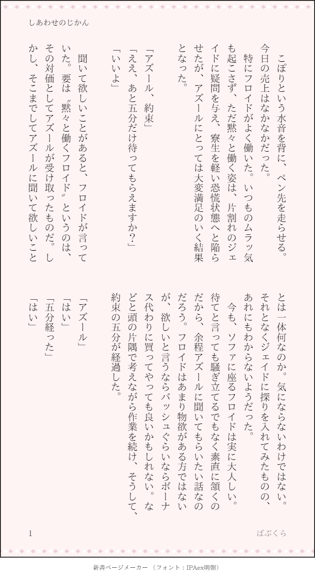 フリート連載、2日目(11/20)のイド...ズ前提のフロアズ。アズに聞いて欲しい話があるというフロ。「だからぁ、オレと結婚してください」唐突に求婚するフロといずれを約束するアズ。