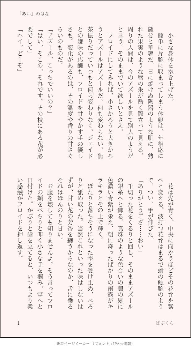 第1回SSシャワー祭り6。小さくなってしまったアズとその魔法薬の材料である花を積みながら、今のアズと昔のアズに思いを馳せるフロ。アズはアズ。「あい」は変わらないけれど…?イド...ズ前提のフロアズ。全3P。あいのはな。