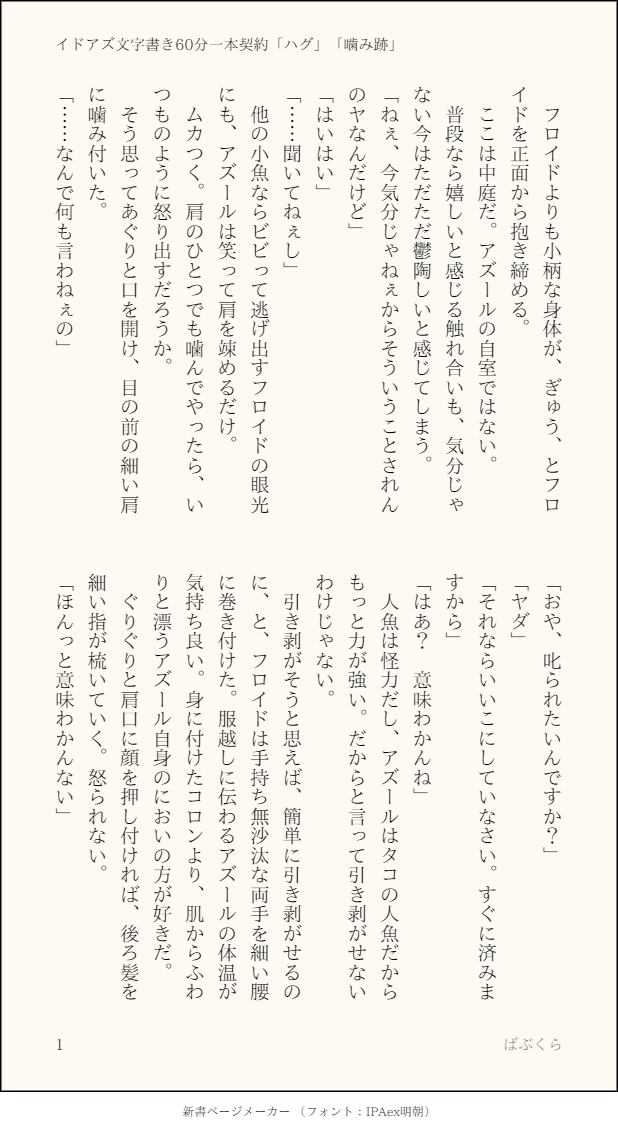 イドアズワンライ。お題は「ハグ」「噛み跡」の両方。イドアズ前提のフロアズになります。誤字脱字があったらすみません~!全6P。