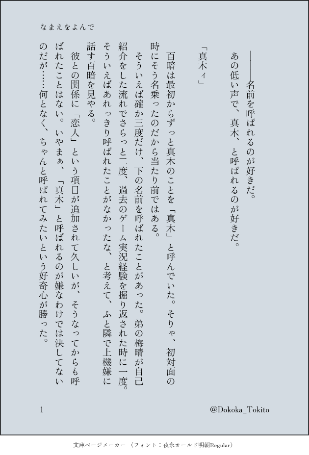 トキトオドコカ☆quiet followDONEdmgの成立済🍑🌰。名前を呼ぶだけ(?)の話。文章のみ。おおよそ5年ぶりくらいの二次創作なので何も気にならない寛大な方向けです。 show all(+7 images) Tap to full screen (size:630x928).Repost is prohibited Let's send reactions! freqpopularsnackothersPayment processing Replies from the creator Follow creator you care about!☆quiet follow トキトオドコカDONEdmgの成立済🍑🌰。名前を呼ぶだけ(?)の話。文章のみ。おおよそ5年ぶりくらいの二次創作なので何も気にならない寛大な方向けです。 8 recommended works funyuukokuDOODLEひよジュンhiyojun日和纯 4 nmr_150DOODLEブラックくん、お誕生日おめでとうございます(ブララクちゃん) 2 hakoniwa_waniDONEガルシンウェブオンリー 7 阿眠眠DOODLE毛茸茸日常1密码Yes 4307 黒川ライDOODLEVOID HO3とKPCのイメソンをKPと俺で歌ってきたよん(カラオケ写真)(HO2も隣にいたけど、悶えてたw) 9 PTouloveDOODLEこの表情で漫画思いついたのでひとまず没 drdrd_zattaDONE媚薬沢深の中編。pass→swfk1128 3840 NoackSPOILER新CoC「デストルドーの使者」ネタバレありパスワードは「デストルドーの使者」どっちが良いか迷ったからどっちも残す初めて厚塗り?をやってみたけど意味わからん 2 1015DOODLEフレうさおさん 3