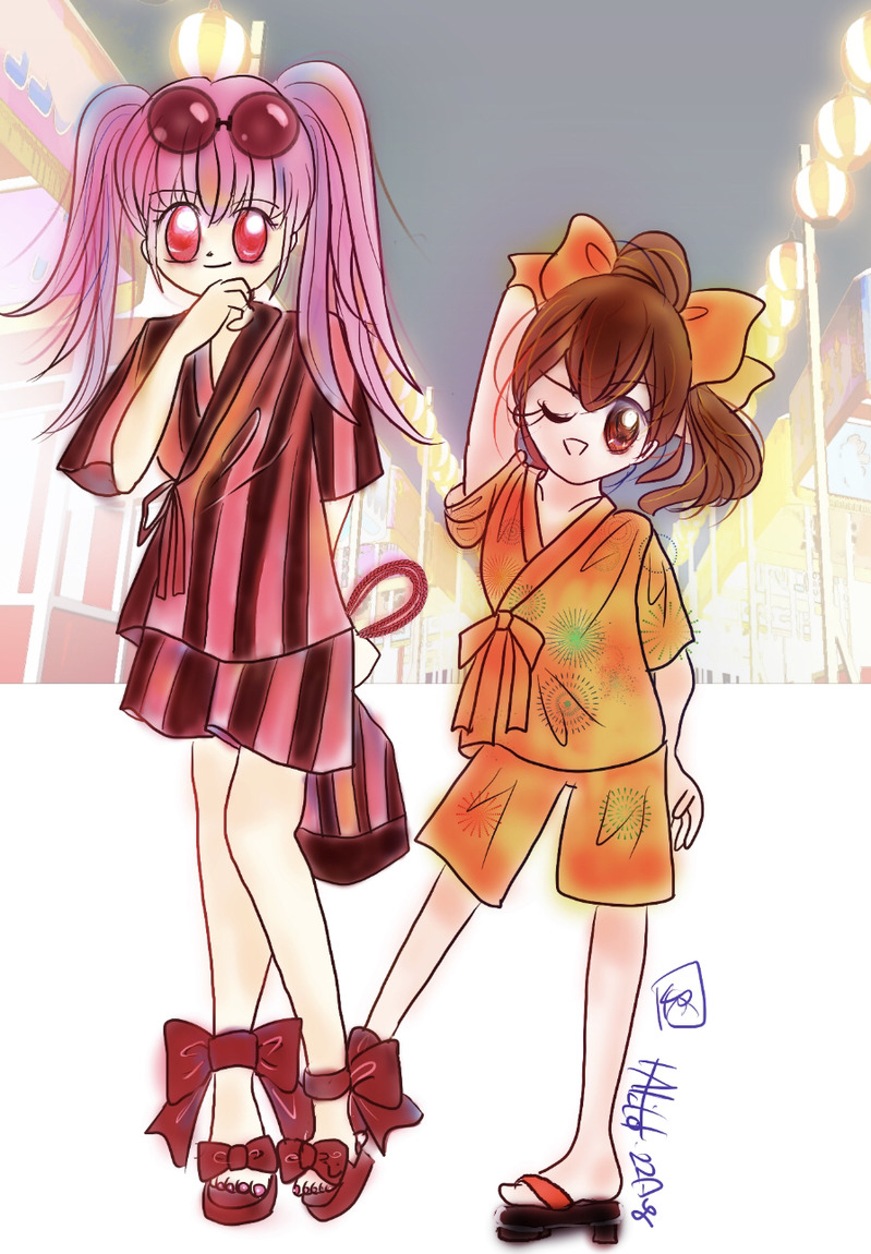 今日はこのあたりまで!仕上げる前に夏が終わるな(^◇^;)ギャルの甚兵衛もいいぞ!なヒルダっちとデューテやです!デューテやは多分浴衣着たかったと思うけど、ヒルダがみんなの着付けしてるから着やすい甚兵衛にしたんかな。柄は水着のをサングラスもサンダルも同じものです。サンダルが不思議と合うのよね≧(*´∇`*)≦浴衣も甚兵衛も≧(*´∇`*)これは若い子だけに似合う物かと思います。