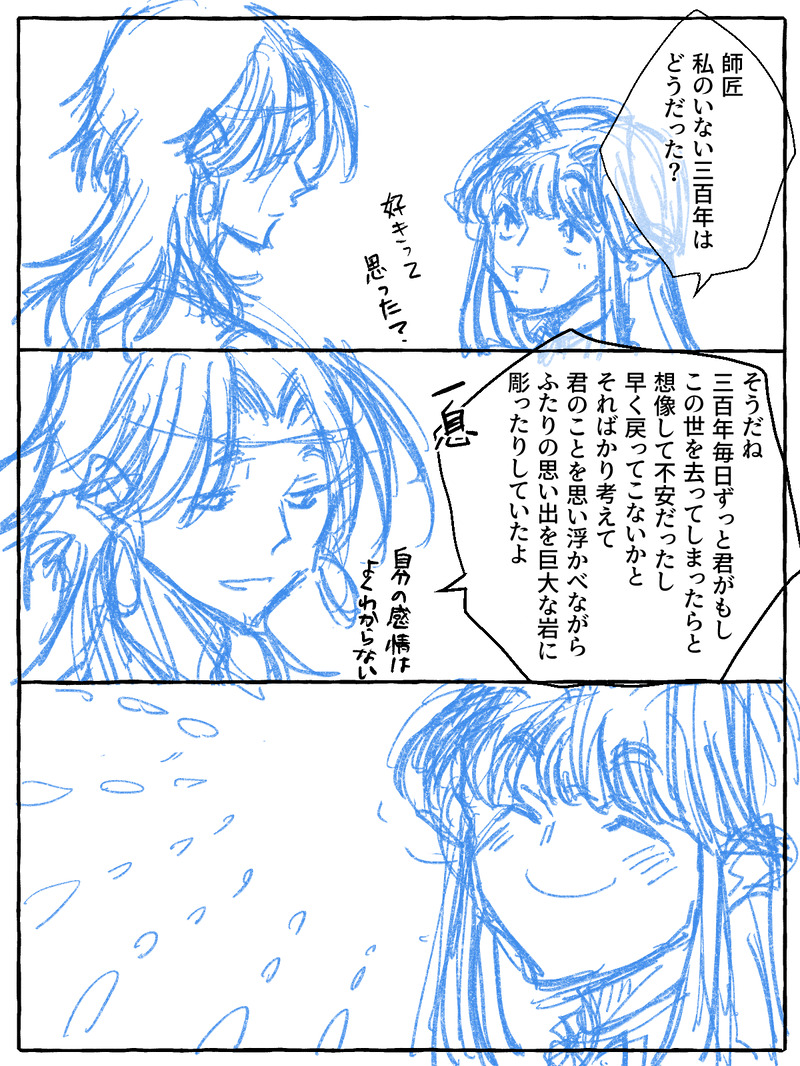 寝落ち☆quiet followDOODLE君清。長らく単行本派でしたが、羅小2楽しみの勢いで未収録分を先行分まで一気に読んだら、師匠の三百年がとんでもなかったです。弟子愛がすごい。 Tap to full screen (size:1200x1600).Repost is prohibited Let's send reactions! freqpopularsnackothersPayment processing Replies from the creator Follow creator you care about!☆quiet follow 寝落ちDOODLE君清。あらゆるジャンルで描きたい出られない部屋。弟子の覚悟とは裏腹に揉まれるのは師匠の方っていう……(師匠は弟子が大切なので……)弟子は作中屈指のイケメンだから多分やさしく揉んでくれる。人目があまりないとラフな脳直ネタをばんばん投げれて楽しいですね。イケメンヒロインと優男の組み合わせ大好き。 寝落ちDOODLE君清。長らく単行本派でしたが、羅小2楽しみの勢いで未収録分を先行分まで一気に読んだら、師匠の三百年がとんでもなかったです。弟子愛がすごい。 寝落ちDOODLEオリジナル。年内いっぱいはこのひとたちを以下略。人外×人間カプ、最初は10組くらい考えるつもりだったけど5組くらいでいいかもしれない。 3 寝落ちDOODLEオリジナル。年内いっぱいはこのひとたちをメインに描いて過ごしたい。目隠れと三白眼描くの大好き。楽しい。 3 寝落ちDOODLE練習楽しい。あと新ジャンルは新鮮。そのうちweiboにも投げてみようかなと思いつつ、中国語も使い方もよくわかってないので怖気まくりなのだった。師弟もふたりとも同じくらい好き。でもニコイチと呼ぶには犬兄の存在がデカ過ぎる。犬兄の何の下心もなく妹分をひたすら大切にしている様が眩しい。三百年後の再会で抱擁をかわす相手が犬兄なところもまた良い。 寝落ちDOODLE君清。練習がてらノリと勢いだけで描いてるんですが、脳直落書きはいつでも楽しい。千歳神仙の新しい扉が開いていく様、いろいろ見たい。