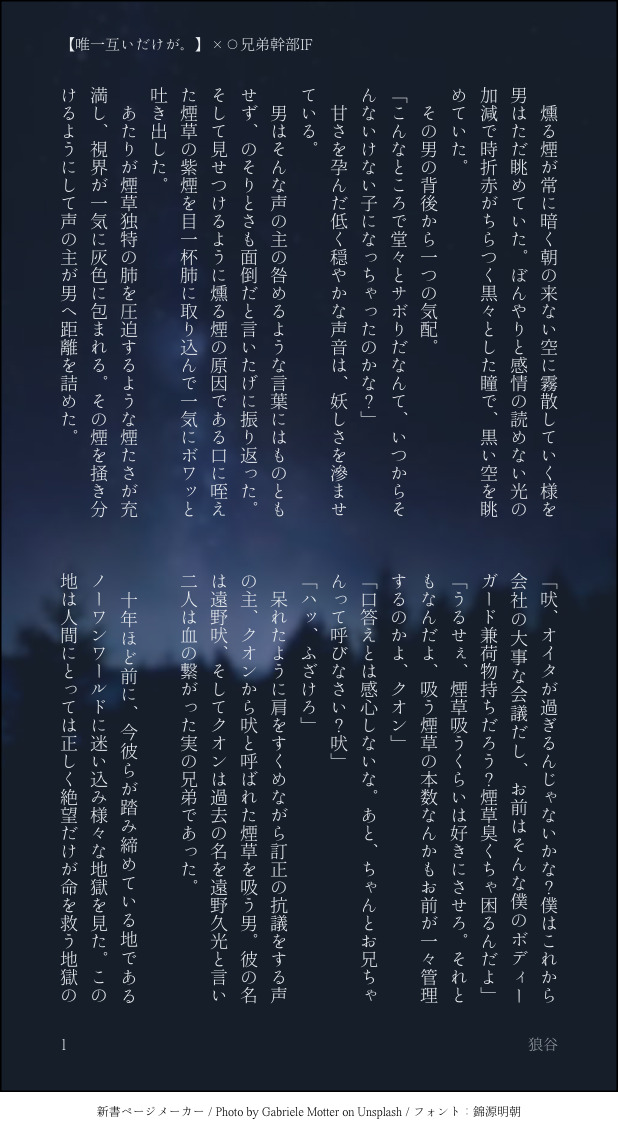 O_kami01tani☆quiet followDONE❌⭕️兄弟幹部IF。捏造、妄想幻覚過多。なんでも許せる方向け。雰囲気で読んでください( ◜ω◝ ) show all(+4 images) Tap to full screen (size:618x1132).Repost is prohibited Let's send reactions! freqpopularsnackothersPayment processing Replies from the creator Follow creator you care about!☆quiet follow O_kami01taniDOODLE⭕️🐺闇堕ちIF捏造妄想幻覚、己の癖を詰め込みまくったので海よりも広い心で何でも許せる方のみご覧ください。相互様の素敵ネタで激ってしまった結果ですん…。相互様には公開する許可をいただいております。闇落ちって…美味しいよねぇ…。特にヒーロー性の高い、あまりにも光過ぎる子が堕ちる様は一生味する。久💡お兄ちゃんの情緒ぐちゃぐちゃにしてくださいよ、⭕️🐺君。 O_kami01taniSPUR ME取り敢えず冒頭だけ…。こりもせずネタを擦り続ける。❌⭕️兄弟敵幹部IF再会編何でも許せる方向け。捏造妄想幻覚過多。 8 O_kami01taniDONE❌⭕️兄弟幹部IF。捏造、妄想幻覚過多。なんでも許せる方向け。雰囲気で読んでください( ◜ω◝ ) 5 O_kami01taniDONE遠里予ロ犬の独白。⭕️🐺君のとある日の夢と目覚めの話。個人の中で思考をぐるぐるさせてこねくり回すのが好きなので、ええ。独白多くねぇかと思ったそこの貴方、正解。わしの癖であり文章書く時のくせです。捏造幻覚過多なのでなんでも許せる方向けです。 5 O_kami01taniDONE50ジャー、平和その後IF話。❌⭕️兄弟、0️⃣🦁昔馴染み、🦄糸者姉妹中心妄想捏造幻覚過多。なんでも許せる方向けです。みんな仲良くしてくれぇ……_(:3 」∠)_誰かわしに🦄ぽよ妹君の絵文字教えてくれ…。 7337 O_kami01taniDOODLE50ジャー、❌⭕️兄弟、❌🔫の落書きその他描き殴りの産物 6