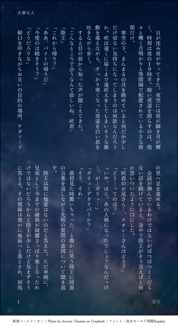 O_kami01tani☆こそフォロできたよいちさん(@YoI_chI_ru )によります素敵企画に、光栄にも参加させて頂きました。私は「夜(18:31〜3:59)」の担当をお任せいただけました。⭕️🐺君と🦁君のゆるっとした会話っていいなぁと。この二人の独特の距離感と関係性好きなんですよね。 すべて表示(+5枚) タップで全画面(原寸:618x1132)無断転載禁止 リアクションをたくさん送って応援しよう! よく使う人気おやつその他支払処理中 作者からのリプライ 気になる人をどんどんフォローしよう!☆こそフォロ O_kami01taniできたよいちさん(@YoI_chI_ru )によります素敵企画に、光栄にも参加させて頂きました。私は「夜(18:31〜3:59)」の担当をお任せいただけました。⭕️🐺君と🦁君のゆるっとした会話っていいなぁと。この二人の独特の距離感と関係性好きなんですよね。 6 O_kami01taniらくがき何だか最近IFばかり書いている気がする。❌⭕️兄弟敵幹部IF。捏造妄想幻覚過多。何でも許せる方のみ御拝読を。書きたいところだけ書いたので、前後は無い。各々で補完して欲しい。わし、⭕️🐺君は純粋で優しい子だからこそ、どちらにも転ぶポテンシャルを持っていると思っている。後罪悪感とか負い目って、人を簡単に堕とすことができる要因になり得るよね、などと思うなどした。 4 O_kami01taniらくがき⭕️🐺闇堕ちIF捏造妄想幻覚、己の癖を詰め込みまくったので海よりも広い心で何でも許せる方のみご覧ください。相互様の素敵ネタで激ってしまった結果ですん…。相互様には公開する許可をいただいております。闇落ちって…美味しいよねぇ…。特にヒーロー性の高い、あまりにも光過ぎる子が堕ちる様は一生味する。久💡お兄ちゃんの情緒ぐちゃぐちゃにしてくださいよ、⭕️🐺君。 O_kami01tani尻を叩く取り敢えず冒頭だけ…。こりもせずネタを擦り続ける。❌⭕️兄弟敵幹部IF再会編何でも許せる方向け。捏造妄想幻覚過多。 8 O_kami01taniできた❌⭕️兄弟幹部IF。捏造、妄想幻覚過多。なんでも許せる方向け。雰囲気で読んでください( ◜ω◝ ) 5 O_kami01taniできた遠里予ロ犬の独白。⭕️🐺君のとある日の夢と目覚めの話。個人の中で思考をぐるぐるさせてこねくり回すのが好きなので、ええ。独白多くねぇかと思ったそこの貴方、正解。わしの癖であり文章書く時のくせです。捏造幻覚過多なのでなんでも許せる方向けです。 5 おすすめ作品 撸君kazekaoruらくがき 9 一七不九らくがきcb刃注意⚠️ 2 stoooooom_らくがきおなそら 現行・未通過NG 月秘匿持ち〇 t_k_128できた原画展福岡開催記念(文字なし・あり) 2 PyDBwaKoTU9nxs3らくがき「徐ろにキスします」の破壊力 もゆる青空らくがきちみちゃん絵チャログ 第二弾羂ちみ似顔絵大会人様の似顔絵に難癖付ける羂ちみイベントは恒例行事にするべきですね。難癖が酷かったりしつこかった場合は、沢山愛してあげる事が効果的です。逃げていきます。 16 あまこらくがき📕⛓️‼️とにかく⛓️が可哀想なので注意☝️ 4 るら。できた龍蛇神パロも脱稿しました!! analog_luvらくがきTFA:バンブルビーのスパークにエッチなコード繋げまくる。