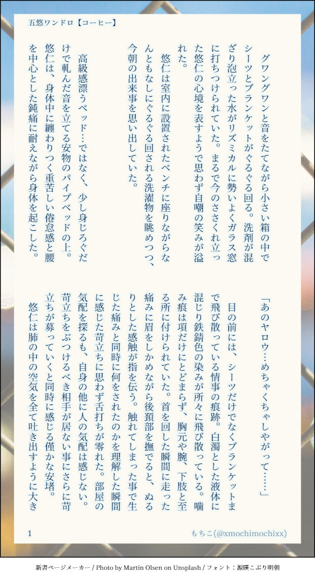 xmochimochixx☆quiet followMOURNINGワンドロ【コーヒー】ちょっとアングラなお仕事をしているごゆと、とーじパパのお話。ワンドロ【別れ道】の続編的なもの。 #小説 novel show all(+6 images) Tap to full screen (size:618x1132).Repost is prohibited Let's send reactions! freqpopularsnackothersPayment processing Replies from the creator Follow creator you care about!☆quiet follow xmochimochixxMOURNING空オレとワンドロの共同企画の際に展示した話【俺の世界は蒼で包まれている】ブルーモーメントに包まれるふたり。 5 xmochimochixxMOURNINGワンドロ【嫉妬】自分のしらない人間と会ってるゆじを目撃した五が嫉妬しちゃうけど……なお話 6 xmochimochixxMOURNINGワンドロ【別れ道】ちょっとアングラなお仕事をしてるごゆのお話。コーヒーの前編になるよ。 8 xmochimochixxMOURNINGワンドロ【声】五条が最後に聞いた声とは…… 5 xmochimochixxMOURNINGワンドロ【ラブレター】ゆじが書いた手紙(ラブレター)とは。 7 xmochimochixxMOURNINGワンドロ【コーヒー】ちょっとアングラなお仕事をしているごゆと、とーじパパのお話。ワンドロ【別れ道】の続編的なもの。 7 related works siro1516TRAINING『小さな子供との夏祭り編』2/2枚 10 starareorangedrDONE恭龍の小説(まだつきあってない) 3 かほる(輝海)INFO平成最後にネップリ折本出します。A6サイズ8ページ。R18小説を二本収録。そのうち一つは、ここで公開済みの「路地でもっこりする二人の話」です。コードは29日の夜遅く(30日に日付が変わる頃)に支部で公開します。サンプルで1ページだけチラ見せ。よろしくお願いいたします。 ももみつDONEマターさんとクラフターさんの、日常の一コマ話。小説。 9 文月ちえり&中の人MAIKING作業進捗?みたいな感じの投稿だけど、現在Newお仕事に夢中で絶賛放置中な執筆中小説の一つ。第1章の序盤で、サイトにて公開中な10,000文字の約半分相当です。#青春 #小説 #中学生 #オリジナル#自家製本 して書籍化予定です!#文学フリマ #前橋 #東京 #文フリ 出店予定 14 kabolove22DONESSメーカーで作った小説です。 8 siro1516INFO先程お伝えした「小さな炭治郎くんと義勇さん」からのご挨拶と「お知らせ」を別で投稿です。 4 かほる(輝海)PROGRESSエアコミアンソロ進捗。やっと攻守交代まで来た(*´艸`*)そして、一番言わせたかったセリフまできた…あぁ満足…まだ終わらないよ(*´ω`*)肝心のセリフに字が重なってる…(´・ω・`)タップすると全部見えるようになります。 zeppei27DONEなんとなく続いている主福のお話で、単品でも読めます。七夕を楽しむ二人と、夏の風物詩たちを詰め込んだお話です。神頼みができない人にも人事を超えた願いがあるのは良いですね。>前作:昔の話https://poipiku.com/271957/11735878.htmlまとめhttps://formicam.ciao.jp/novel/ror.html 3654 recommended works 文月ちえり&中の人MAIKING作業進捗?みたいな感じの投稿だけど、現在Newお仕事に夢中で絶賛放置中な執筆中小説の一つ。第1章の序盤で、サイトにて公開中な10,000文字の約半分相当です。#青春 #小説 #中学生 #オリジナル#自家製本 して書籍化予定です!#文学フリマ #前橋 #東京 #文フリ 出店予定 14 starareorangedrDONEずみ流ずみ(ずみ→流)の小説。dropシリーズのやつ。相変わらず本当になんでも許せる人向けです注意 3 創作部部誌班DONEタイトル:不純異族交友作者:智紫国基テーマ:海辺の縁日今年のテーマ「海辺の縁日」を舞台に書いた小説です。ちょっと不思議な出会いと友情の物語。 6750 かほる(輝海)DONEシティーハンター冴羽獠×槇村香原作以上の関係獠と香ちゃんが好きなかほるさんには「ほら、目を閉じて」で始まり、「ここが私の帰る場所」で終わる物語を書いて欲しいです。できれば3ツイート(420字)以内でお願いします。#書き出しと終わり #shindanmakerhttps://shindanmaker.com/801664だって、好きなんだもん(*´艸`*)しょうがないよね😂😂 434 かほる(輝海)DONEシティーハンター冴羽獠×槇村香原作以上の関係ワードパレット22.北極星幾星霜/ひとり/導く 395 たまのSPOILER最後にイラストがあるので小説も画像で失礼。異動してバラバラになってる時点で「なんでこんな設定にしちゃったんだろう」って自分が一番悲しかったし、まさか彼が泣くシーンを書く日が来ると思わなかった。でも、いつまでも同じままでいられない3人を書きたかったのも自分なんです。ケンから千百合への、男女という枠にはまらない愛の形が、ちゃんと読み手に伝わればいいなと思う。 8 かほる(輝海)DONEシティーハンター冴羽獠✕槇村香原作以上の関係惚気る冴羽😂 1606 わ縞 wajimaDONE主ニル生存if想いを確かめ合った夜 4 鯉登陽DONEDK女装調教ハメスクワット前編看板に偽りありは最早いつもの事です、女装とハメスクワットは後半で出ます。ところでハメスクワットってもしかしてメジャーじゃない…?そんなことないよな… 6086