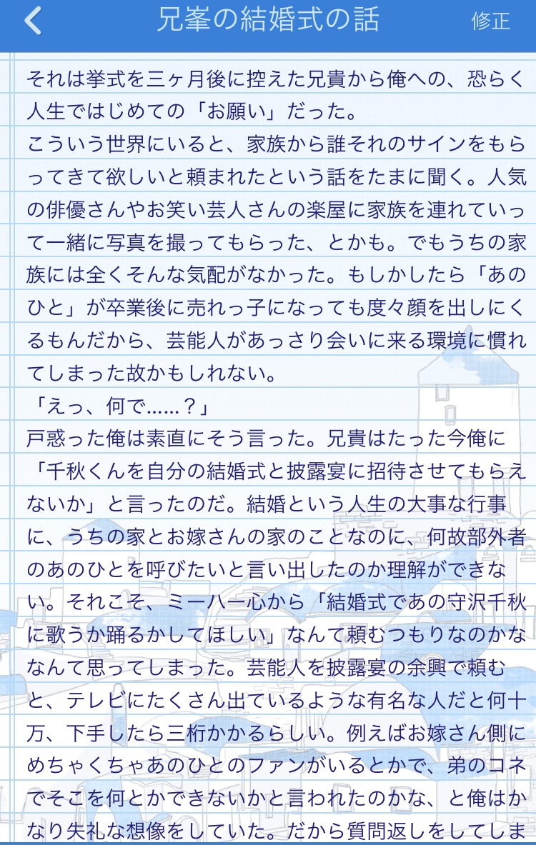 ひかり☆quiet followPROGRESS高峯誕にあげるか迷ってるやつ思ったより長くなりそう、現時点で4000字くらいいってる Tap to full screen (size:750x1183).Repost is prohibited Let's send reactions! freqpopularsnackothersPayment processing Replies from the creator Follow creator you care about!☆quiet follow ひかりPROGRESS初夜みどちあ、高峯がヘタレで情けないほどいとおしくてかわいくて大好きなので何度でも書きたい。(過去作の続きだよ) ひかりPROGRESSこの前麻婆豆腐だったから、今度はお鍋の話。 ひかりTRAINING診断メーカーのお題で書きました 6 ひかりMOURNING2年前の翠千ワンライお題「早起き」の書きかけボツネタの完成版。3ページ以降が今回の書き足し分。 6 ひかりPROGRESS高峯誕にあげるか迷ってるやつ思ったより長くなりそう、現時点で4000字くらいいってる ひかりDOODLE未成年の高峯にお酒買ってこさせる守沢の話※この後の展開は左右どっちでもご想像におまかせします 5