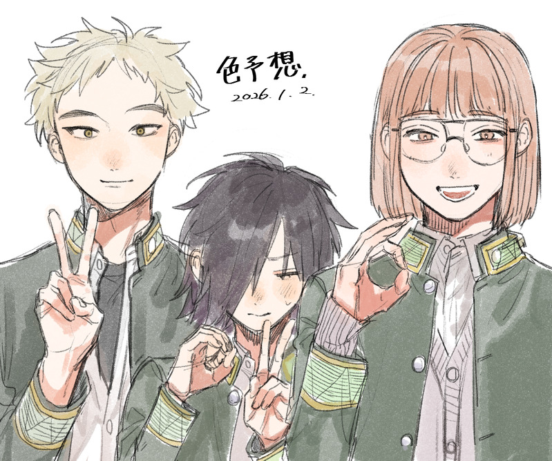 2026年ということで、今一番ハマってる子たちを…色予想も兼ねて描きました。眼鏡くんもうちょっと暗めの茶髪だと思ってます。杠君は黒いトーン貼られてたので黒髪だろうなというのはある。目の色はわからないけれど。予想の段階だから色味が当たってたとしてもめちゃくちゃ違和感の塊なので早く正解出てほしいです…あと名前も教えてね