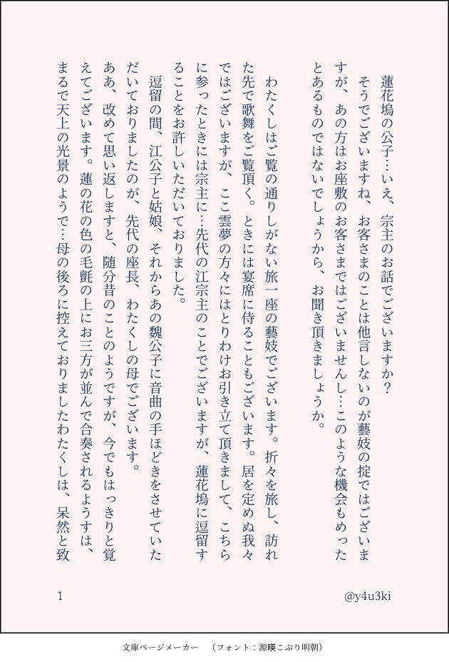 y4u3ki☆quiet followDONE曦澄ワンドロ「秘密」で書いたもの。オリキャラしか喋らないんですけど、第三者からみた在りし日の蓮花塢を書きたかった。あと師姉HPBの想いを込めた。 #曦澄 show all(+4 images) Tap to full screen (size:630x928).Repost is prohibited Let's send reactions! freqpopularsnackothersPayment processing Replies from the creator Follow creator you care about!☆quiet follow y4u3kiDONE曦澄ワンドロワンライのお題が「夢」だったので考えたけどこんなんしか思いつかなかった。やばい。まじでやばい。キャラ崩壊とかいうレベルじゃない。ギャグセンスのないやつが書いたギャグ。怒らないでほしい。 1633 y4u3kiDONEまた子どもの頃の江澄が出てくる話。ちょっと射日前。某有名ウィーンミュージカルからなんか色々お借りしててでも色々と違うところはあって、なんにせよ怒られそうではあるのでびくびくしています。なんでもいいよ、怒らないよ、という方だけどうぞ。pass:怒らない?→y/n 10 y4u3kiDONE曦澄ワンドロ「秘密」で書いたもの。オリキャラしか喋らないんですけど、第三者からみた在りし日の蓮花塢を書きたかった。あと師姉HPBの想いを込めた。 5 y4u3kiDONEはじめて書いた曦澄。現代AUで付き合ってる。曦が寝てる時にしかキスできない澄とそれを知ってるけど黙ってる曦、的なお題に沿って書いたやつ。 5 related works yaji1_mdDONESMhttps://poipiku.com/5280290/7208921.htmlの続き*SMのはなし*R-18 成人済みの方のみどうぞ*若干のモブ(女)要素あり*現代 2571 yaji1_mdDONESM先日ツイートした『Mの自覚がある晩吟君がSMのお店でオーナーの曦臣と出会う話』です。短く区切っていくつか続けるつもりの話です。*SMの話なのでR-18 成人済みの方のみご覧ください*若干のモブ(女)要素があります*現代*SMの話です 2565 yaji1_mdDONESMhttps://poipiku.com/5280290/7208921.htmlの続き*SMの話*R-18 成人済みの方のみどうぞ*若干のモブ(女)要素あり*現代 1848 yaji1_mdDONESMhttps://poipiku.com/5280290/7208921.htmlの続き*SMの話*R-18 成人済みの方のみどうぞ*若干のモブ(女)要素あり*現代1プレイ目(ソフト) 5653 takami180PROGRESS長編曦澄17兄上、頑丈(いったん終わり) 1337 takami180PROGRESS恋綴3-5(旧続々長編曦澄)月はまだ出ない夜 1437 tia_10l0DONE「春の気まぐれ」フォロワーさんの誕生日に捧げた曦澄SSです。 6 takami180PROGRESS恋綴3-2(旧続々長編曦澄)転んでもただでは起きない兄上 3050 yunoDONE江澄を喜ばせよう企画。曦→澄のつもり。閉関した江澄が犬と戯れてます。最初はギャグのつもりだったんですが、着地点を失敗しました。2023/01/28 01:36 up 2880 recommended works たなかDONE江澄が藍曦臣の裂冰を咥えようとしちゃう話魔が差したやつ② 7 キ・リンDONE「伽觜待」13P*r18*現パロ身嗜みの話。#曦澄2021/5/2PASS:二人の名称を英小7文字で 13 sgmDONEお風呂シリーズ可愛いね~~~!!ってとこからの派生。江澄の右手の後ろに蓮の花が見える気がしました。フラワーバスですか。ちょっと見えすぎじゃないでしょうか。江宗主。大丈夫ですか。いろいろと。 2456 澪標(みおつくし)DONE暑い日に恋人に会いに来た藍曦臣のお仕事猫と一番涼しい所でお昼寝する江澄めっちゃ可愛くない???という妄想の具現化です。 13 夢魅屋の終雪DONE曦澄【Dom/Subユニバース】4特殊設定、オリジナル設定が含まれます。なんでも食せる萌える方向けです。鈍すぎる澄が好きです 8227 夢魅屋の終雪DOODLE閉関中の藍曦臣のところに、小さな「ちょん」がやってきたお話 2235 oriya16kfSPUR ME「チョコレートより甘く(仮)」#曦澄 バレンタインのお話 その4(連載はここまで!完全版をピクシブに掲載しています↓)https://www.pixiv.net/novel/show.php?id=17005280バレンタインポストでいただいたお題でお話を書いていきます。ポイピクのログにも、pixivにもある「solveシリーズ」の二人のお話。(前作読んでなくても大丈夫です) 6 0Raya0DONE2022.01.29 曦澄WEBオンリーペーパーラリー参加作品テーマ:『愛情表現』 2327 手癌哒哒DOODLEaph 玫瑰花茶魅魔r 补档 14