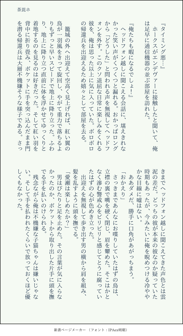 shiotoma67☆quiet followDONE荼毘ホ。本誌243話、244話ネタバレあり。次が出るまでに書きたかった。 Tap to full screen (size:618x1132).Repost is prohibited Let's send reactions! freqpopularsnackothersPayment processing Replies from the creator Follow creator you care about!☆quiet follow shiotoma67DOODLEいちゃいちゃどろあませっくしゅサスペンダーもえラストスパート🙆♀️時間ない🙆♀️びえん 7 shiotoma67PROGRESSめちゃくちゃ辛くなってきたので進捗あげ😂がんばれ〜〜!!!😂 10 shiotoma67DONEたりさんの企画してくださった利き小説に投稿しました。お題は『羽』です。ホの羽が白くなる話も羽を燃やす炎もいつか書きたいと思ってたので、今回書きたいところを全部吐き出すことができました。今回の炎ホは付き合ってはいなくて、炎は片想いだという自覚がなく、でも会いたいと思う程度には気に入っていて、毎度どうにか理由をつけながら愛瀬を重ねていたところです。離婚してるかしてないかはご想像にお任せします。 10 shiotoma67DOODLEひげをそりたいホークスと、そらせたくないエンデヴァーの話 8 shiotoma67DONE炎ホシチュ交換会に参加させて頂きました!たりさん、素敵な企画ありがとうございました! 5 shiotoma67DOODLE流行りにのっかって陥没乳頭の過去ログです!必修科目になりますように!!! 4