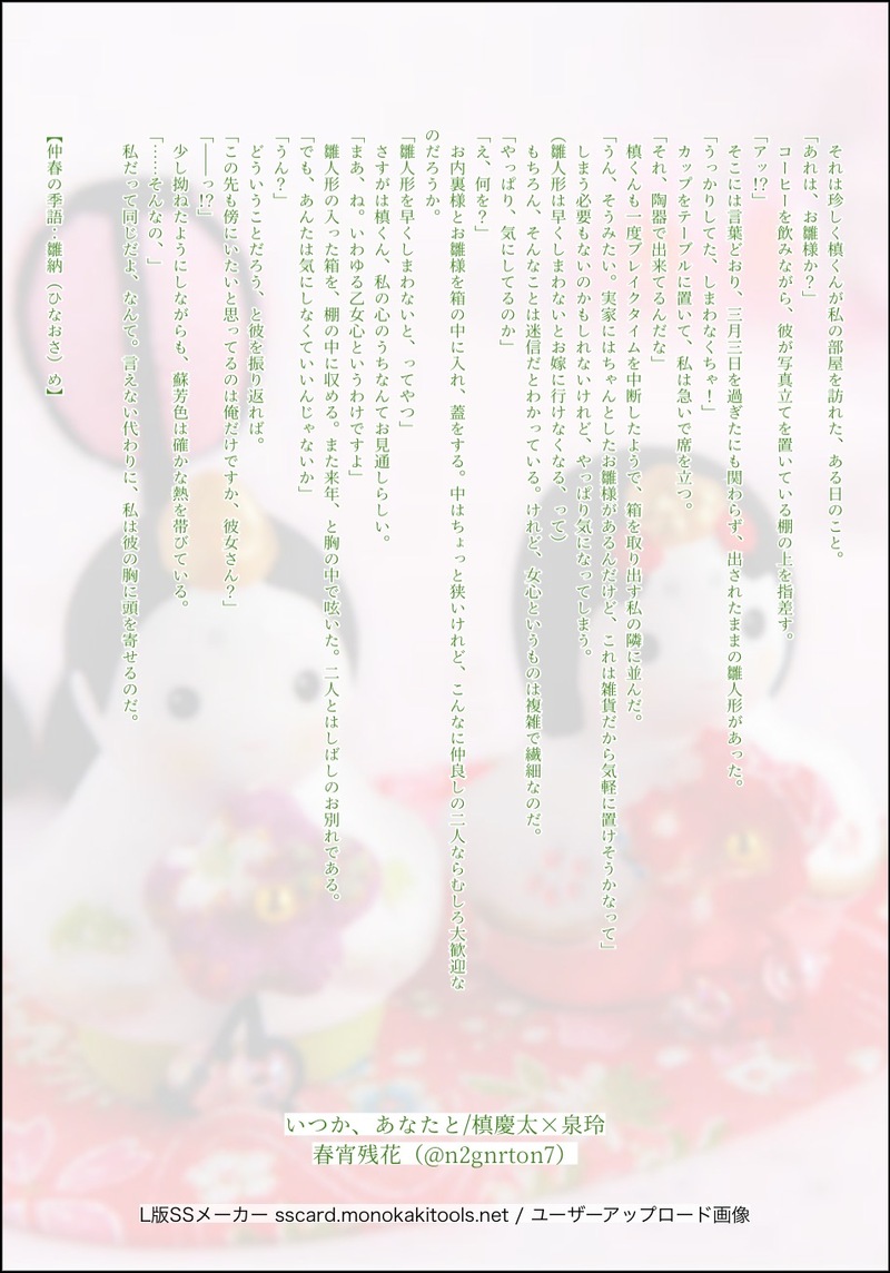 n2gnrton7☆quiet followDONE【スタマイ:槙玲】/エアコレ2022春・お題作品企画「いつか、あなたと」/お題:雛納(ひなおさ)め『彼女さん』という呼び方と、そのときだけに敬語を交える槙くんがとっても好きです。何度でも見たい。完全なる余談ですが、将来もしかしたらエムトイズ製のお雛様が二人のお家に置かれるのかもしれませんね。 #スタマイ stamae #槙玲 Tap to full screen (size:954x1365).Repost is prohibited Let's send reactions! freqpopularsnackothersPayment processing Replies from the creator Follow creator you care about!☆quiet follow n2gnrton7DONE9月に頒布予定の神玲再録本に載せる予定の一本です。初掲載時より加筆修正しています。 2849 n2gnrton7DONE【アンゼロ:春メイ】展示作品/都々逸+SSWebオンリー・今宵一番街にて2テーマ:秋【秋日和】------------甘いものが好きだと知れてから、彼女とスイーツ巡りに出かけるようになった。同士が見つかった嬉しさで、それ以上のことはないと思っていたんだが。やはり、自分を偽ることはできないらしい。 n2gnrton7DONE n2gnrton7DONE【アンゼロ:匠メイ】・展示作品Webオンリー・今宵一番街にてテーマ:冬【生姜酒】……その風邪を肩代わりしてやりたい。寝込んでいるあんたが、辛そうで苦しそうで。世話を焼きながらも俺は、きっと甘えてしまっている。 n2gnrton7DONE【アンゼロ:広メイ】・展示作品Webオンリー・今宵一番街にてテーマ:冬【冴ゆ】……寒空の下でたとえ迷っても、何度でもあんたが見つけてくれる——。俺は、それを期待してしまう。 n2gnrton7DONE related works HweQziDOODLE yuto1102DOODLEまきれ~のえっちな絵漫画(絵漫画……?)あとちょっとが待てない感じたまにはええやんと思い仕事に追われて会えない日々が続き自分でも驚くくらい泉玲が足りなくなって真夜中に家に押し掛けた槙くんと、同じく槙くんが足りなくて会えて嬉しい泉玲が盛り上がっちゃったんじゃないかな……玲ちゃんのお顔少々ゆるくなってしまったけど久々のえっちだったからということで勘弁あとブレスレット左右違ってるかもという不安 yuto1102DOODLEまきれ~のえろ絵 めんぞうPAST槙玲ちゃんは可愛いですね。(初夜はまだ見れておりませんおそろしや。) 2 ほとめMOURNING中身のないRevel玲ちゃん 4 hino_stmyDONE『お風呂にする?ご飯にする?それとも…』をテーマに書いたSS 槙玲 3 hino_stmyDONEお題『電話越し』槙玲電話越しに槙くんの具合が悪いと気づいた玲ちゃん。 hino_stmyDONE槙くんお誕生日SS 4 jun_horai0111swDONEフォロワーさんとの企画で、オールマイティな書き出し作ったらどんなお話出来上がるかな?的なやつ❤冒頭一段落がフォロワーさん作です⸜(*ˊᵕˋ* )⸝槙×玲ちゃん 5 recommended works 小夜の倉庫DONE「Marking」(潔玲)/2018.3.2プライベートでの潔くんの嫉妬台詞があまりにエモかったので。 5 jun_horai0111swDONE年末年始SS樹玲ちゃんです。 2 jun_horai0111swDONEツインテールの日樹玲ちゃん hino_stmyDONEお題『電話越し』槙玲電話越しに槙くんの具合が悪いと気づいた玲ちゃん。 hino_stmyDONE志音くんお誕生日SS hino_stmyDONEバレンタイン?SS青山樹(→玲)甘くないです。自覚した想いにくすぶる樹さん。チョコレートが出てくるので、バレンタインに上げてみた。 3 jun_horai0111swDONEこちらも別バージョンの、フォロワーさんとの企画で、オールマイティな書き出し作ったらどんなお話出来上がるかな?的なやつ❤冒頭一段落がフォロワーさん作です⸜(*ˊᵕˋ* )⸝耀×玲ちゃん 3 sirohumoDOODLEいまイベ(ハッピーマリッジはゆずらない♡)のスペシャルステージを見た感想。カナメくんと玲ちゃんの噛み合わない結婚トークが聞きたい。 sirohumoDOODLEひかるくんのスキル発動台詞がいい感じにふわふわしてて可愛い