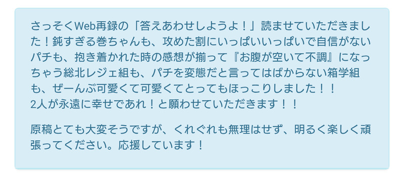 mixmix2☆quiet followINFOweb再録の感想ありがとうございました!🙇 総北と箱学だと同級生達の雰囲気が違うんだろうな~って漠然と思っているのでその波動が伝わって嬉しいです🥰 ここ最近原稿疲れで明るく楽しくできていたかな!??と心配ではあるんですがなんとか気合で入稿しました!💪💪 Tap to full screen (size:1080x486).Repost is prohibited Let's send reactions! freqpopularsnackothersPayment processing Replies from the creator Follow creator you care about!☆quiet follow mixmix2TRAINING全身練習207 mixmix2INFOコメントありがとうございました!🙇 2コマは自分がやっていること・感じたことをこのキャラがやったらどうなるんだろう?って考えると起承転結の起と結がぽんと浮かぶような製法になってます(それがぽんと出ない時はお蔵入り) 色々とこそ練したりと仕入れてきているので気づいて下さってすごく嬉しいです……!😭 こちらもやっと秋を感じるようになってきました🍁コメ主さんも御身体お気をつけてお過ごし下さいね mixmix2INFOコメントありがとうございました!めろめろになっていただき本当に嬉しいです😭 まだまだ六溝山レースを見届けたい!ってアチアチな気持ちはあるので日々定食作りに勤しみたいと思います🍚🏭 mixmix2INFOコメントありがとうございました!🙇 絵に関して細かく見て下さってとても嬉しいです!また色んな方が描かれている中で推しと言ってもらえて感無量ですありがとうございま……!😭 ちょっと最近健康に陰りが見えていたので気をつけますね💪💪 mixmix2TRAINING全身練習206 mixmix2TRAINING全身練習205 recommended works mixmix2TRAININGT&M練習法1⃣。時間をおいてどれだけ覚えてるかって方法だけど人間ぽやぽやに忘れますね…… jijangDOODLE BeiQiDOODLE汉澈 龟责 Rin67595350DONE180 ▽▲▲リスカ アムカ何でもオッケーって人だけ mixmix2DOODLEなんでもない東巻 🐟️( ’-’ 🌭)DOODLE用心棒さんの眉毛はBだとヨウジンボウスキーに教えてもらった📝 T_T_T_A_NDOODLE还是🐺🐰 OxAlis075DOODLE何も考えずに描いたらくがきいでんのりょーまといぞーが好きってだけ LaciD_0DOODLE一边被侵犯一边吃自己的呕吐物!好倒霉!