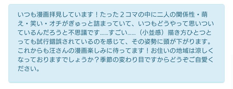 コメントありがとうございました!🙇 2コマは自分がやっていること・感じたことをこのキャラがやったらどうなるんだろう?って考えると起承転結の起と結がぽんと浮かぶような製法になってます(それがぽんと出ない時はお蔵入り) 色々とこそ練したりと仕入れてきているので気づいて下さってすごく嬉しいです……!😭 こちらもやっと秋を感じるようになってきました🍁コメ主さんも御身体お気をつけてお過ごし下さいね
