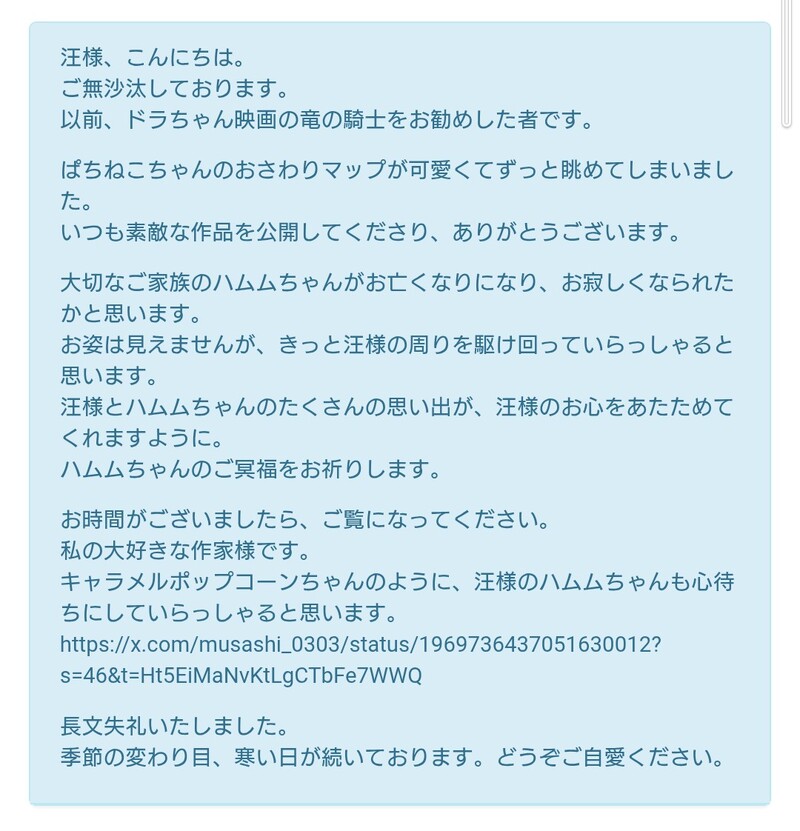 コメント・以前はおすすめドラちゃんをありがとうございます!衝動的に描いたものだったのでそう言って下さり嬉しいです🥰 ハムムに関しても優しい言葉をかけていただきありがとうございます……!🙇まだ側にいてくれたり天国でも何不自由なく過ごしていてくれたら家主は嬉しいな~とまたちょっと泣いてしまいました。またおすすめの作品も非常に共感できて泣いてしまい顔面がシャバシャバです😭笑