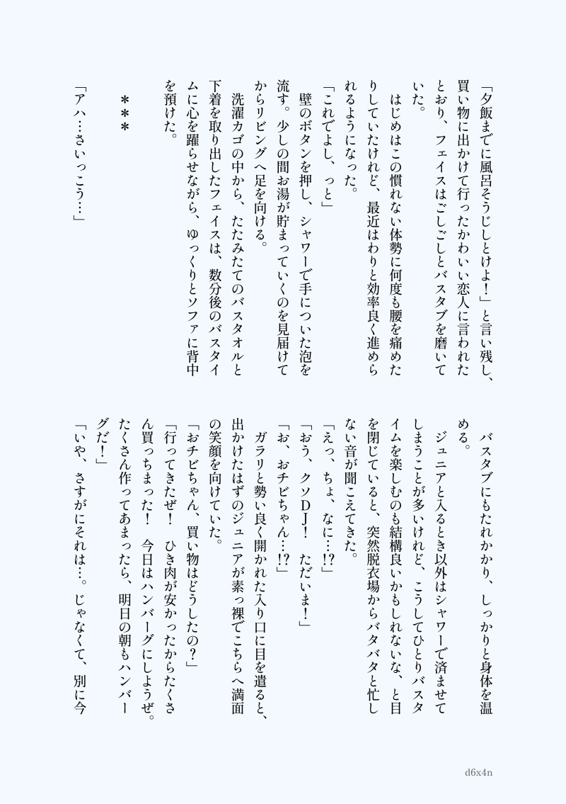 d6x4n☆quiet followDONE◇お風呂タイムのフェイジュニふたりで暮らすふたりがお風呂に入るお話しです!(パロディのため苦手な方はご注意ください) show all(+2 images) Tap to full screen (size:2664x3780).Repost is prohibited Let's send reactions! freqpopularsnackothersPayment processing Replies from the creator Follow creator you care about!☆quiet follow d6x4nDONE2022.02.12「Rockなキミにショコラを添えて2」 小説展示🎧さんお誕生日おめでとうございます!①ホテルで夜を過ごすフェイジュニのお話しです!事後表現、うっすらそういった表現があります。18歳以上の方は【yes】でどうぞ! 3 d6x4nDONE2022.02.12「Rockなキミにショコラを添えて2」 小説展示③突然に🎸からお誘いを受けるフェイジュニのお話しです!うっすらとそういった表現があります。18歳以上の方は【yes】でどうぞ! 3 d6x4nDONE2022.02.12「Rockなキミにショコラを添えて2」 小説展示②2/14早朝のキースさんとフェイジュニのお話しです!昨年のワンドロライさま生誕企画の際に載せたものを加筆修正しております! 3 d6x4nDONEフェイジュニ♀ふたりで暮らしている🎧くんが夏バテになるお話しです! 4 d6x4nDONEフェイジュニ ワンライ お題▶寝不足 をお借りしました!大学生🎧🎸に巻き込まれる🍺さんのお話しです!現パロ、飲酒描写がありますので苦手な方はご注意ください。 3 d6x4nDONE◇朝のフェイジュニふたりで暮らすふたりがケンカをした次の日の朝のお話しです!(パロディのため苦手な方はご注意ください) 4 recommended works yanyDOODLE继续美美贴贴😍 5 kashi_919INFO初回頒布:3/1 横浜産業ホールマリネリア-スプラケット25ラ27-葉の箱通販BOOTH:https://kashi919.booth.pm/クロスフォリオ: https://xfolio.jp/portfolio/kashi_919/shop 11 ビフテキDONEキス漫画の漢訳版です!(翻訳→ふみかさん) 13 lychee__puaDOODLE怒られちゃったあ…はぁーい♡トーン練習で初めて使ったので見にくくて申し訳ないです>_<承太郎受け一応r18作品ですので成人されてる方のみご覧下さい!pass:18↑?yes or no さけめっちゃのむPROGRESSsernちまちま描いてる進捗ここに追加していきますpass⇒18↑? yes or no 24 鬼忍者可愛いDOODLE⚠R18 異種 腐向け 体格差 ⚠性欲ツヨツヨな鬼の男の子クレナイ君♡強い雄として認識してるウォルフさんに雄の本能のまま求められてドキドキしてたらいい!!大きすぎると思うのに期待しちゃうエッチな子であれ!!鬼は人間に比べて欲のまま楽しく生きてるイメージだし性欲ツヨツヨだといいなぁ!狼は発情期のニオイで理性飛んじゃう!(ウォルフさんは若造と違い理性制御出来るけど相手もその気なら楽しむw 2 砂乃(サノ)REHABILIポイピク稼働記念に過去絵手直しage↑↑〜‼︎ おわりDOODLE頭の中きみでいっぱい 2 calmdestorm2DONE【腐?】ロマサガ2R猫の日だったので、ちっちゃいネコオーンを描きましたちょっとダンボク風味 32